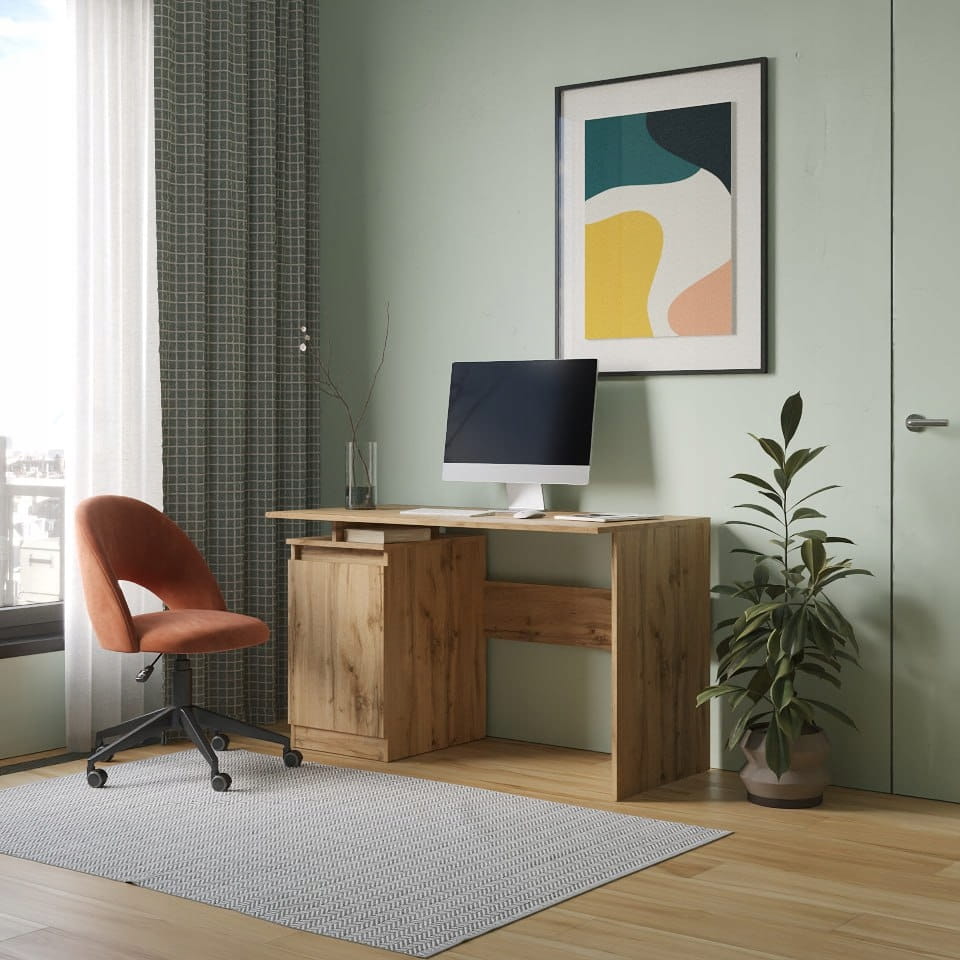STERN T‑5 to minimalistyczne biurko, które łączy oszczędną formę z wysoką funkcjonalnością. Szeroki blat 120 cm pomieści laptop, monitor oraz materiały do pracy, a zamykana szafka pozwoli szybko ukryć dokumenty i akcesoria, by utrzymać idealny porządek. Wykonane w kolorze dąb wotan, wprowadza do wnętrza ciepły, naturalny akcent, który świetnie komponuje się zarówno z nowoczesnymi, jak i klasycznymi aranżacjami.