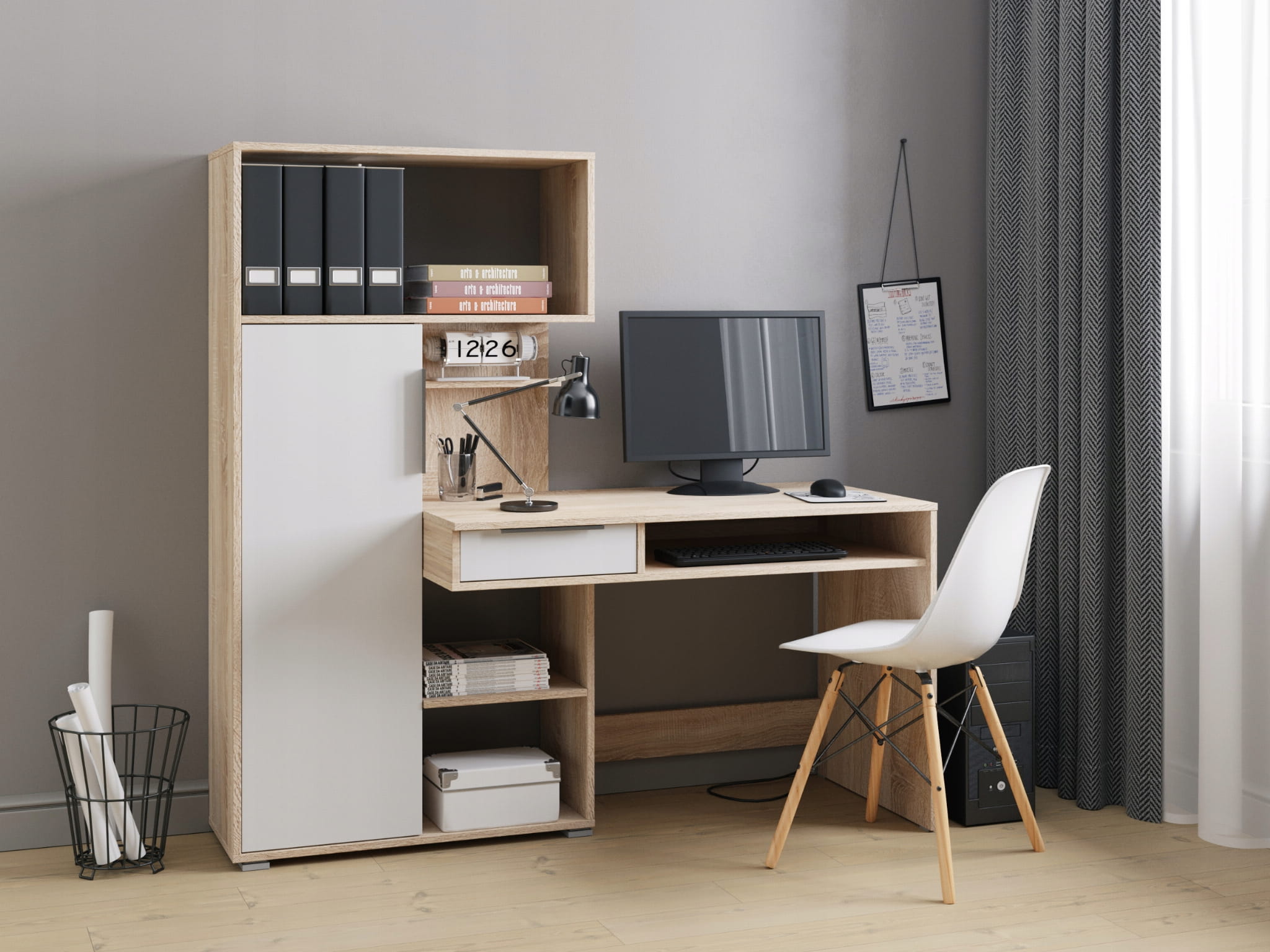 Kompaktowy kącik do pracy i nauki z wbudowanym regałem. Jeden mebel = wygodny blat, szuflada, zamykana szafka i aż 9 półek – wszystko w loftowym duecie ciepłego dębu z matowym grafitem.