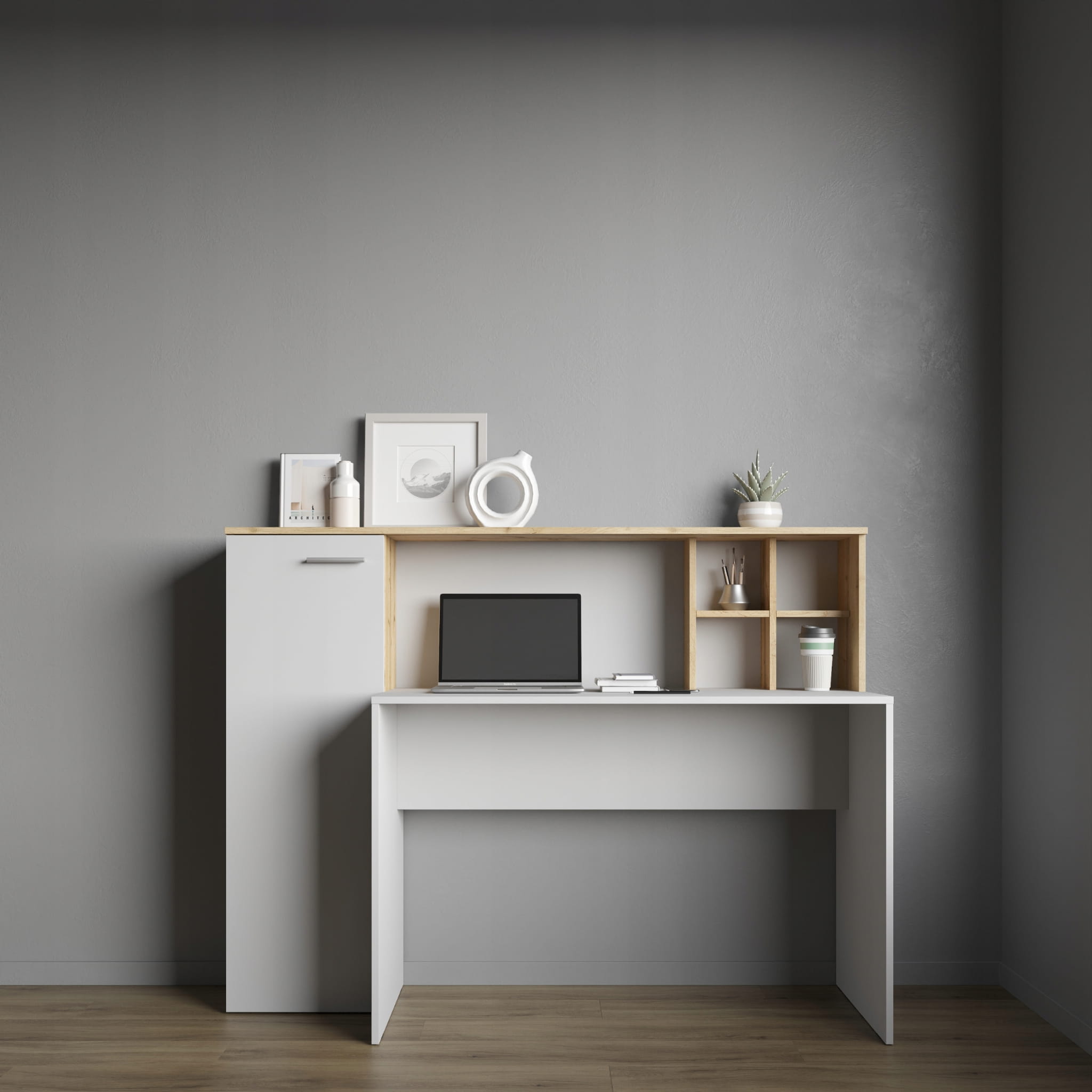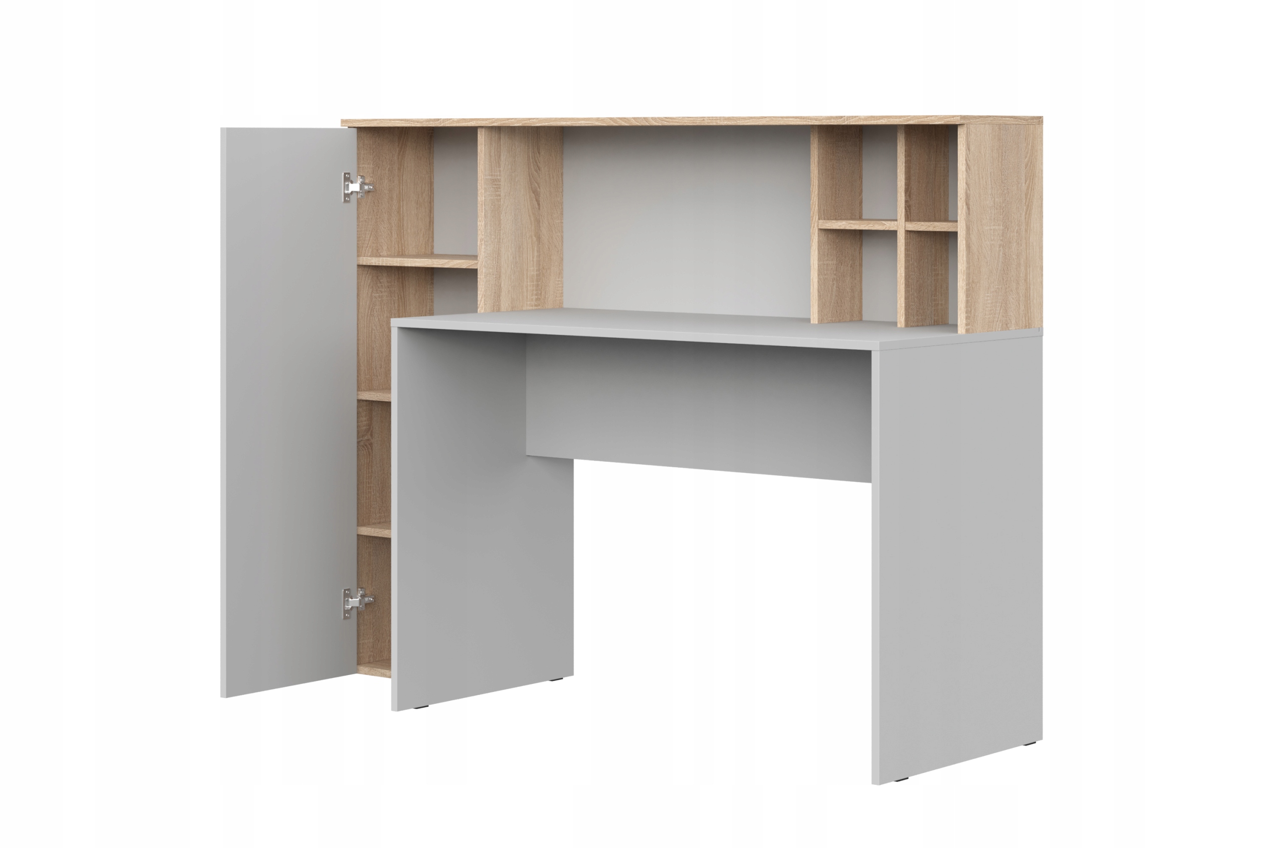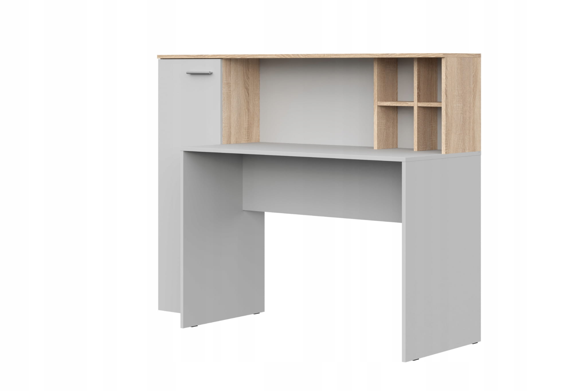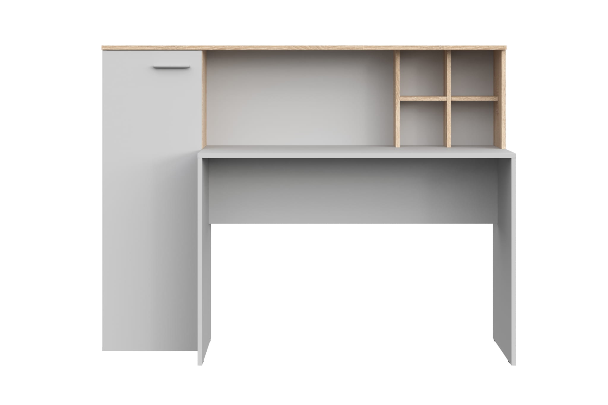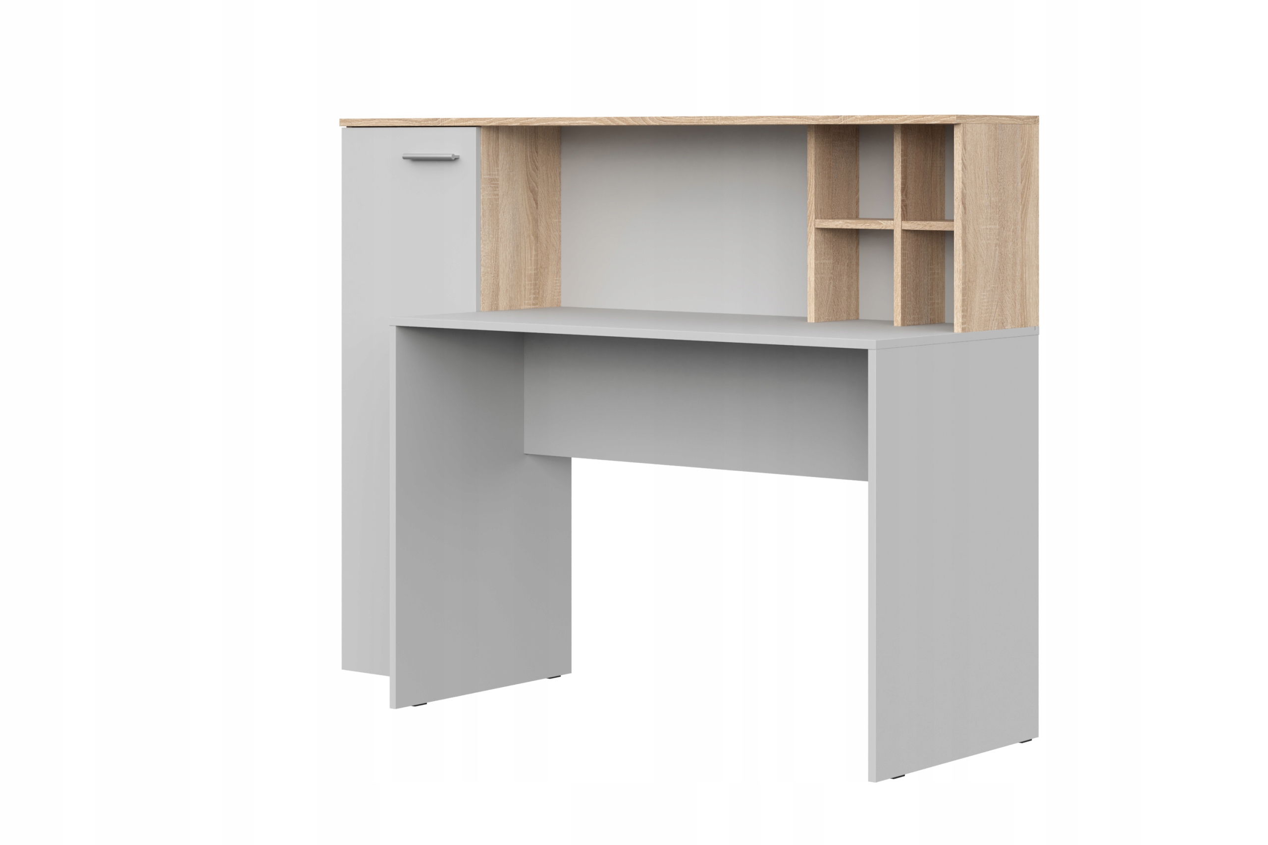Biurko FUN to kompaktowe centrum pracy i nauki, w którym funkcjonalność spotyka się z minimalistycznym stylem. Kontrast śnieżnej bieli z wstawkami w kolorze dąb sonoma tworzy świeży, nowoczesny efekt i ociepla wnętrze. Po lewej stronie ukryto pojemną szafkę na segregatory i akcesoria, dzięki czemu wszystko pozostaje w zasięgu ręki, ale poza zasięgiem wzroku. Nad blatem znajduje się praktyczna nadstawka z szeroką półką oraz czterema kwadratowymi przegródkami – idealnymi na książki, zeszyty czy dekoracje – które pomagają utrzymać porządek i nadają biurku lekki, uporządkowany wygląd.