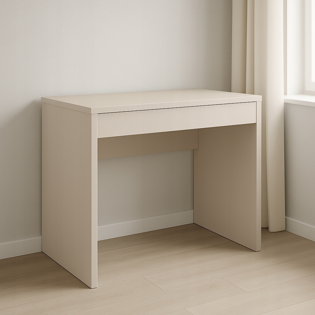 Minimalistyczne, kompaktowe biurko z szufladą w nowoczesnym kolorze kaszmir. Sprawdzi się jako lekkie stanowisko do pracy z laptopem, elegancka toaletka lub wąska konsola pod lustro w przedpokoju. Jasny odcień rozświetla przestrzeń i perfekcyjnie komponuje się z aranżacjami skandynawskimi, boho czy klasycznymi