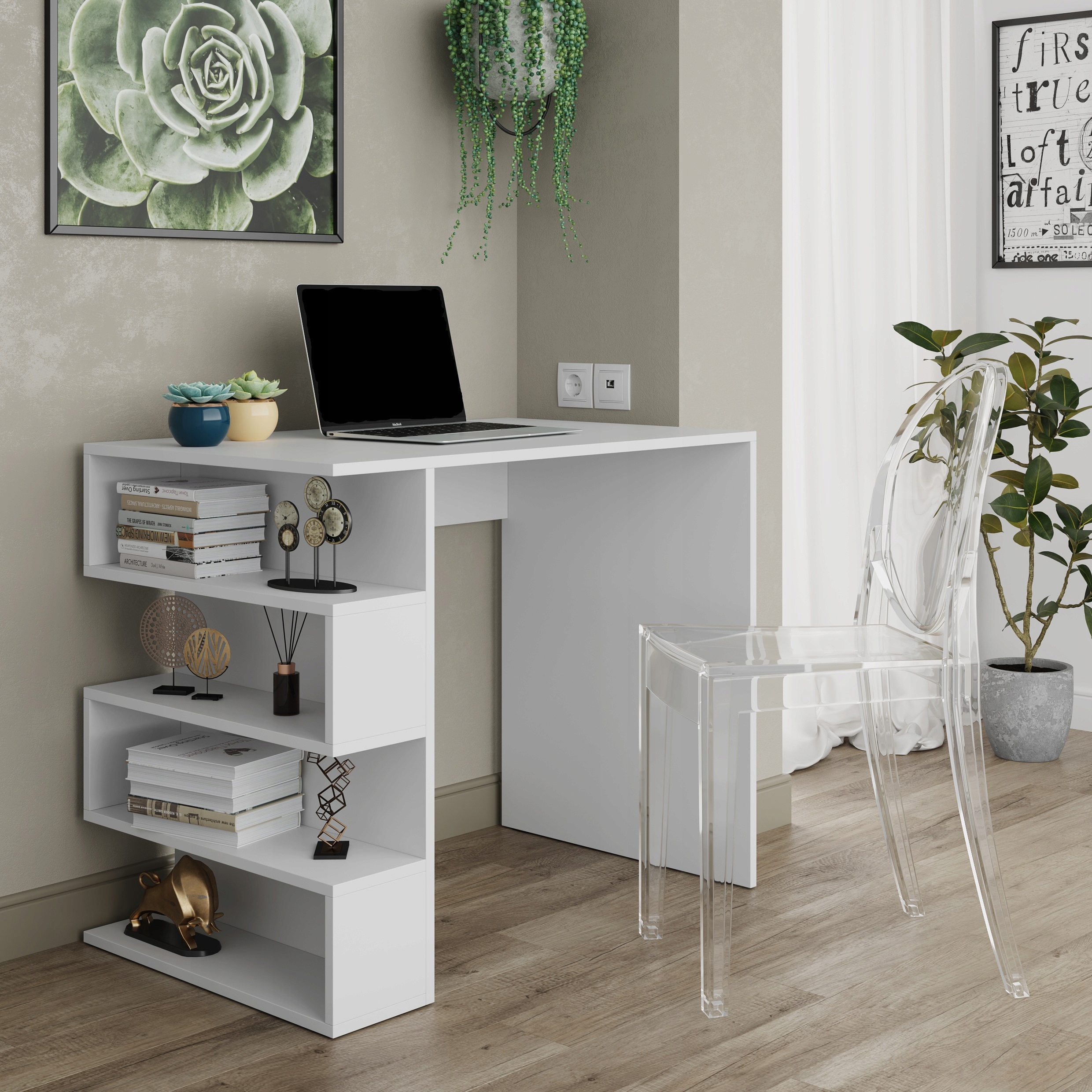 Zorganizuj swoje domowe biuro tak, by sprzyjało skupieniu i… wyglądało świetnie. Biurko STERN T‑12 to niewielki, biały pomocnik, który zmieści się nawet w wąskiej wnęce przy oknie. Prostokątny blat pomieści laptopa oraz notatnik, a cztery otwarte półki – od podręczników po designerskie bibeloty – pozwolą utrzymać porządek bez sięgania do szuflad. Matowe wykończenie odbija miękkie światło i sprawia, że mebel stapia się z otoczeniem, optycznie powiększając przestrzeń. Jeśli potrzebujesz dyskretnego, ale solidnego stanowiska do pracy lub nauki, STERN T‑12 będzie strzałem w dziesiątkę.