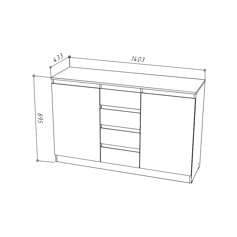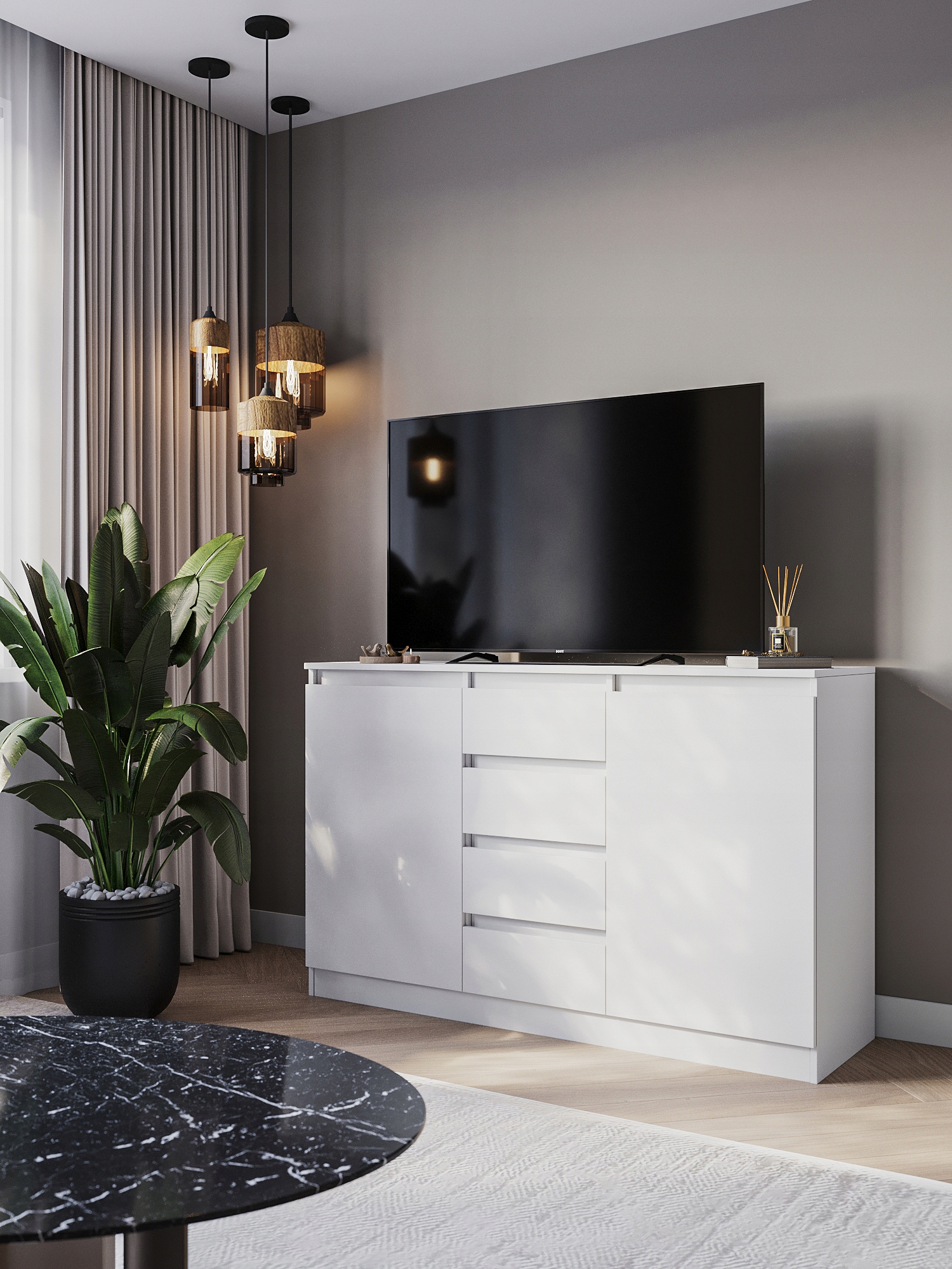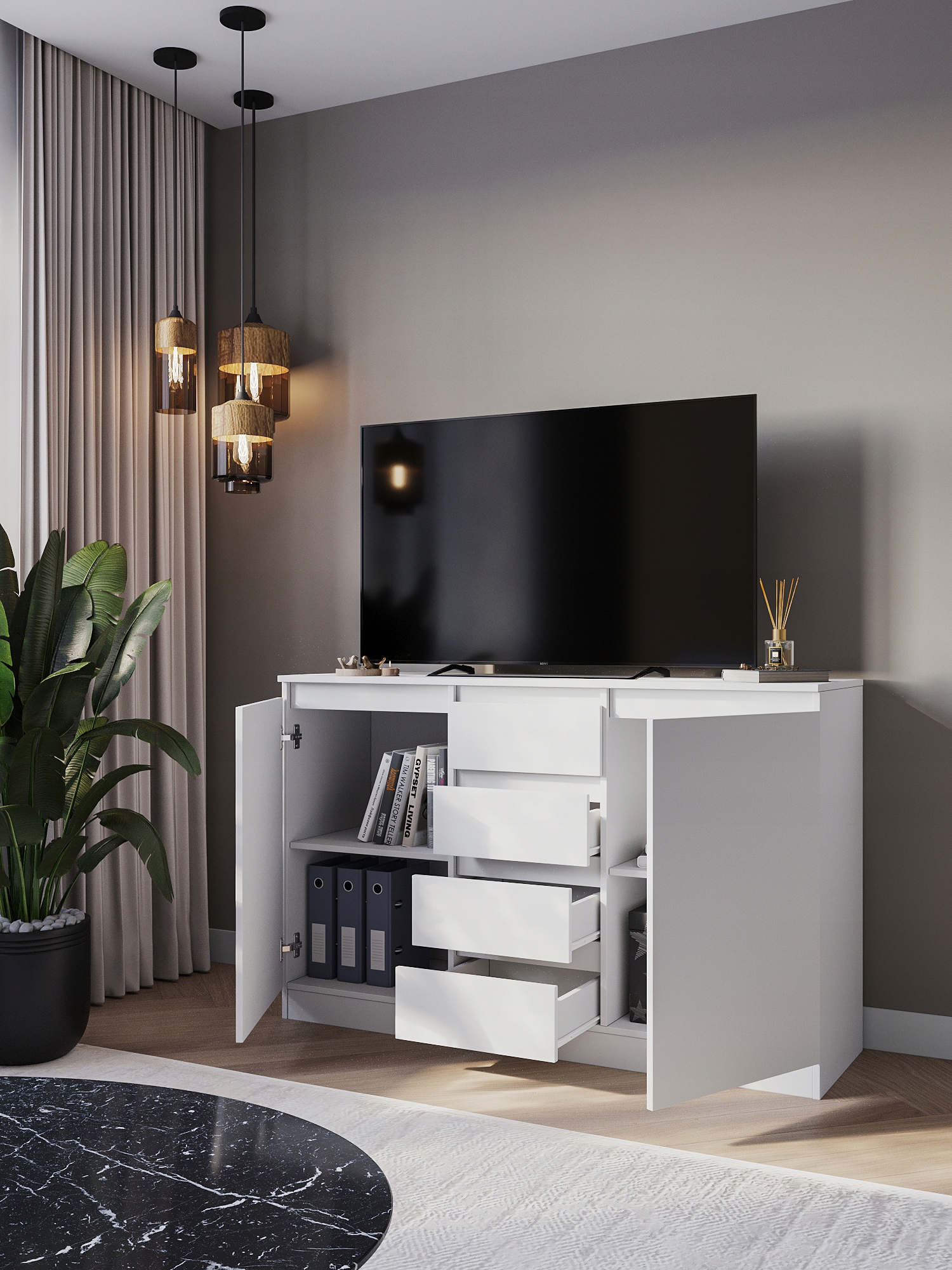 - Funkcjonalny układ – 4 szuflady + 2 zamykane komory zapewniają dużo miejsca na dokumenty, tekstylia czy akcesoria RTV.