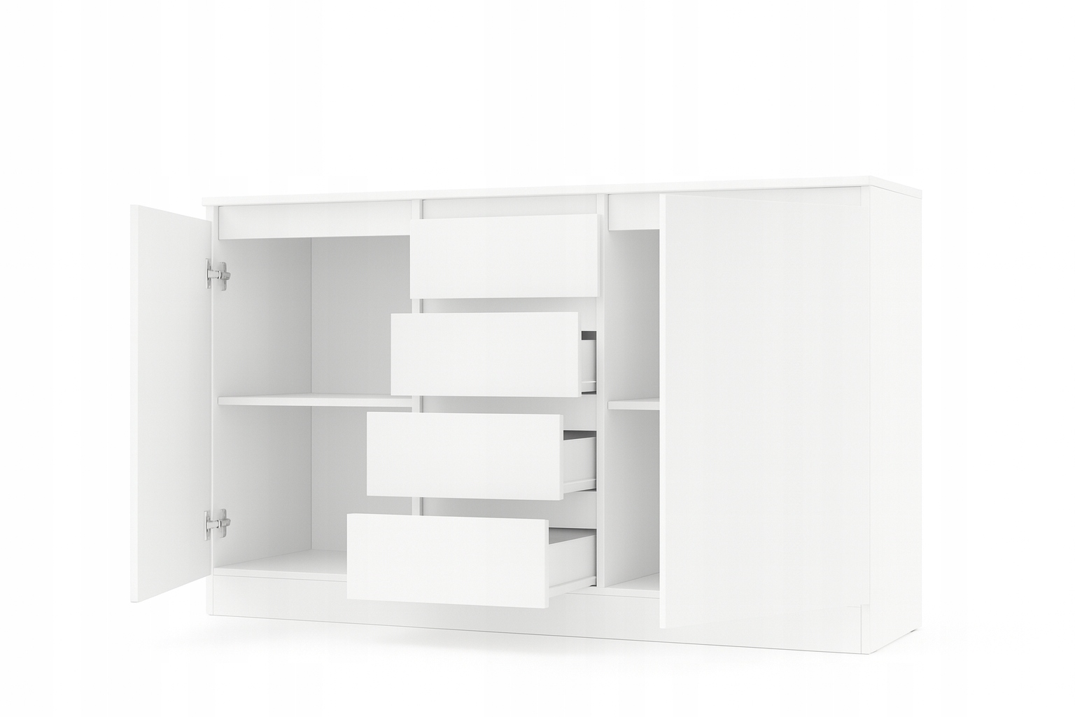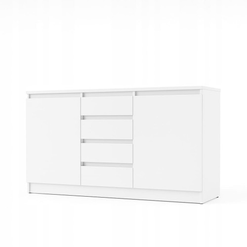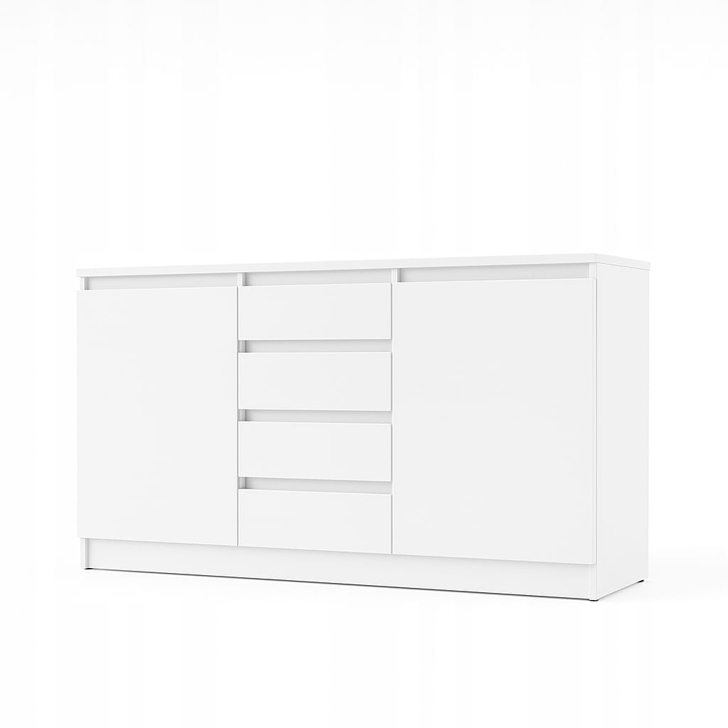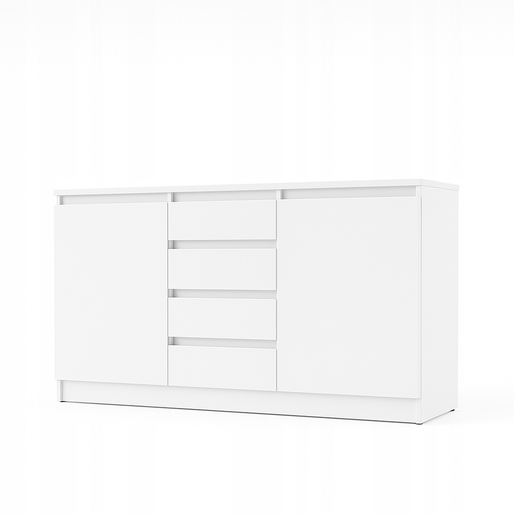 Nowoczesna, minimalistyczna komoda w kolorze bieli z gładkimi frontami bez klasycznych uchwytów. Układ z czterema centralnymi szufladami i dwiema bocznymi szafkami pozwala łatwo rozdzielić przechowywanie. Prosta bryła na pełnej podstawie prezentuje się lekko, a jednocześnie stabilnie. Neutralna biel i czyste linie sprawdzą się w salonie, sypialni czy jako szafka RTV.
