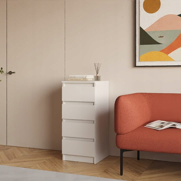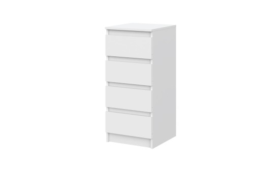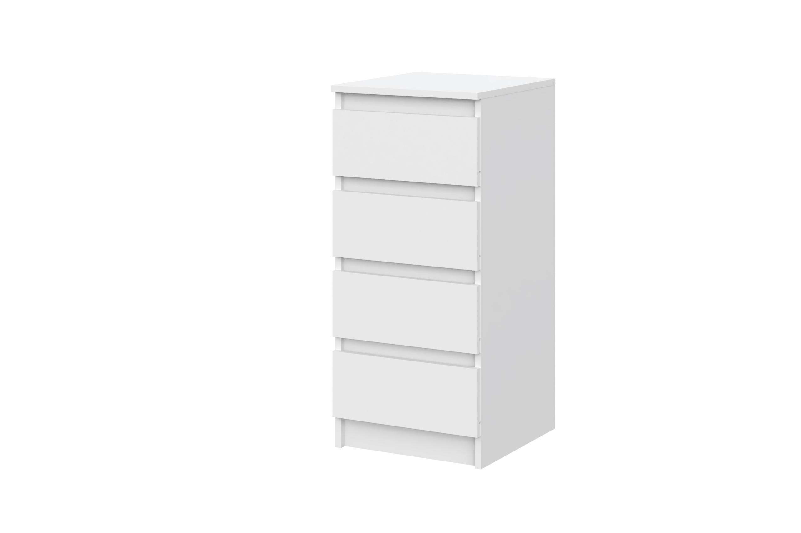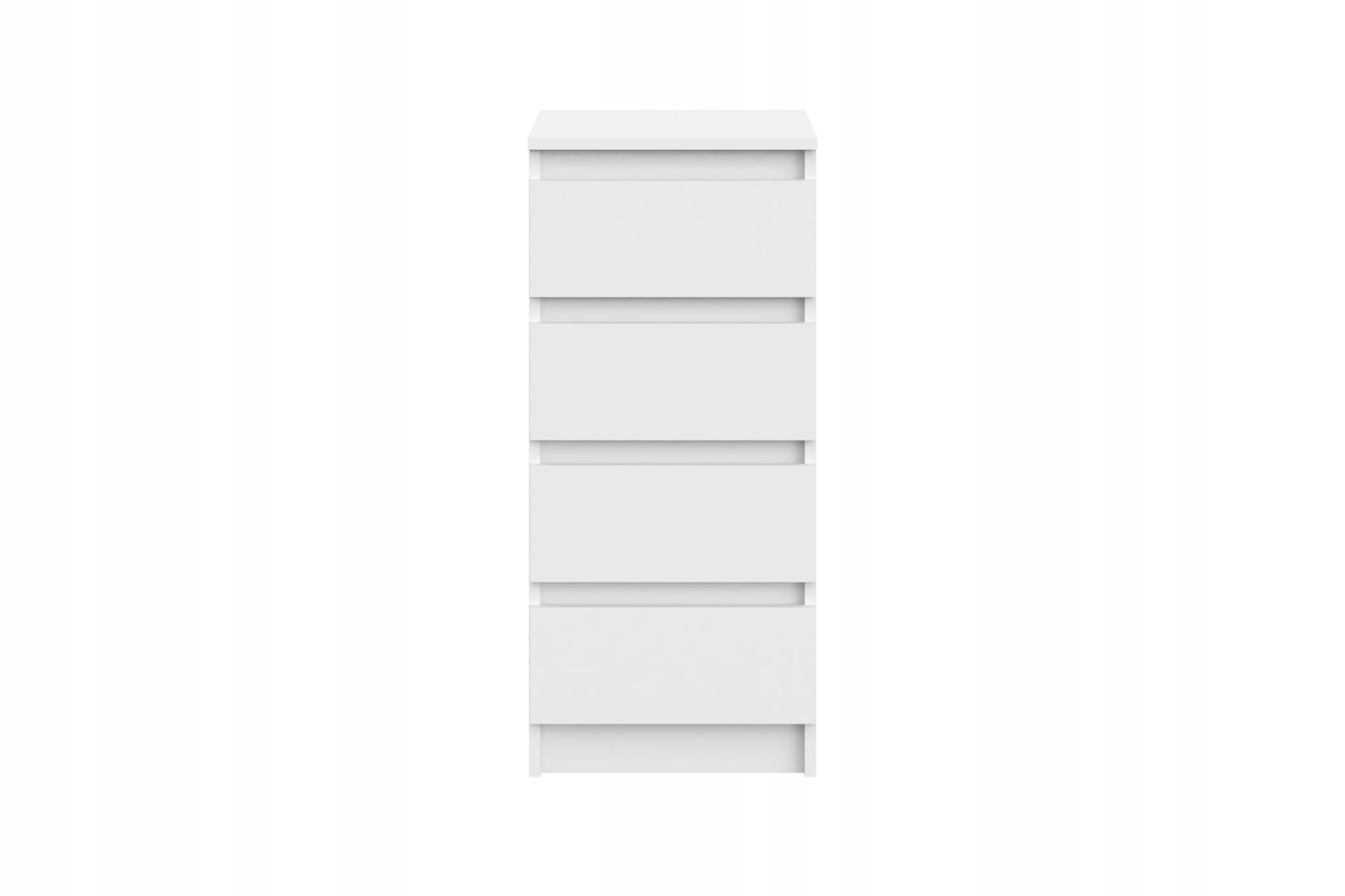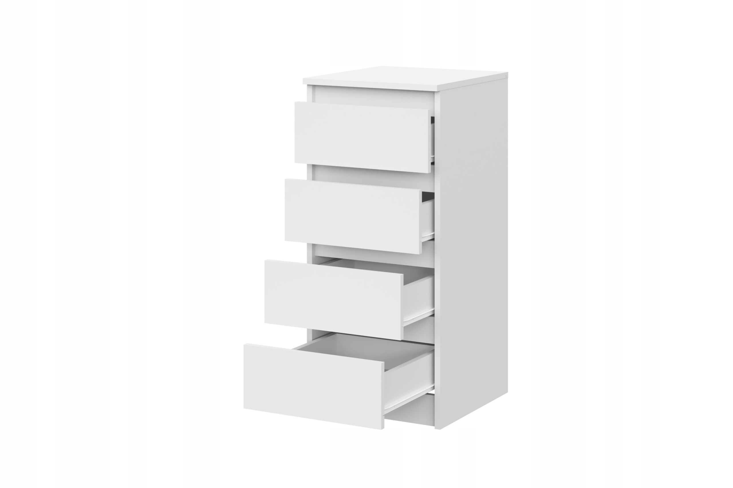 Nowoczesna, minimalistyczna komoda w kolorze białym z czterema pojemnymi szufladami. Fronty bez uchwytów nadają jej elegancki, gładki wygląd, a prosta forma sprawia, że łatwo wpasuje się w różne style wnętrz — od skandynawskiego po nowoczesny. Idealna do sypialni, salonu lub biura, oferuje funkcjonalną przestrzeń do przechowywania ubrań, dokumentów czy drobiazgów.