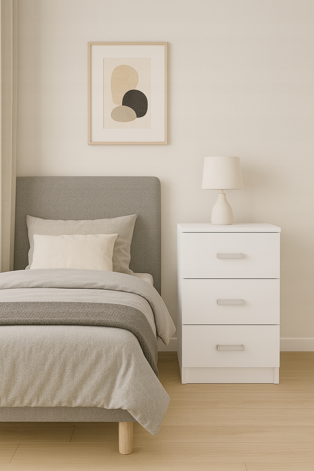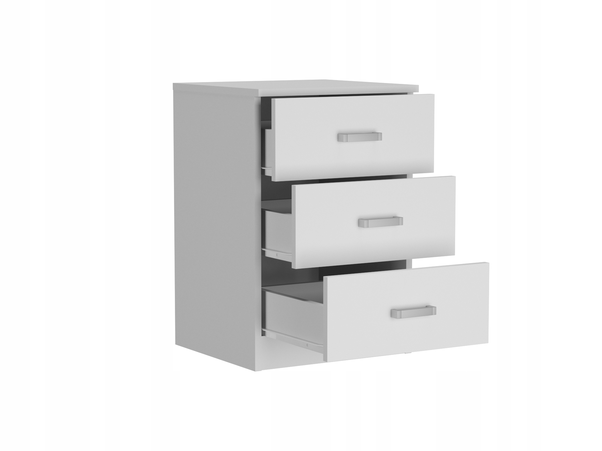 Zgrabna, minimalistyczna komoda w kolorze białym, która wprowadzi porządek w sypialni, salonie, pokoju młodzieżowym czy przedpokoju. Trzy równe szuflady pomieszczą bieliznę, dokumenty i drobiazgi, a gładkie fronty z klasycznymi uchwytami łatwo wpasują się w aranżacje loft, skandi i nowoczesne. Kompaktowa bryła nie przytłacza przestrzeni, a blat przyda się na lampkę, roślinę lub organizer.