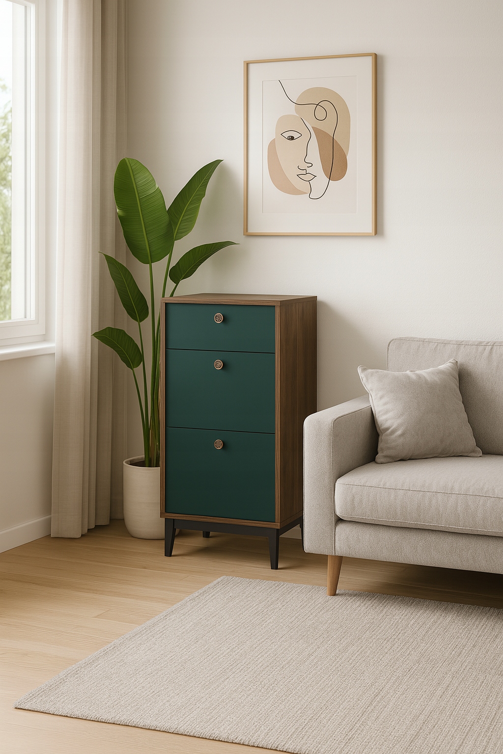 Stylowa, smukła komoda, która łączy matowe fronty w kolorze butelkowej zieleni ze szlachetną, drewnianą ramą i złotymi gałkami. Wysokie metalowe nogi dodają lekkości i ułatwiają sprzątanie pod meblem, a kompaktowa podstawa świetnie mieści się nawet w węższych wnękach. Za eleganckimi frontami kryją się 2 szafki oraz 1 szuflada, idealne na tekstylia, dokumenty i akcesoria; blat posłuży do wyeksponowania lampy, roślin lub dekoracji. Mebel do salonu, sypialni czy reprezentacyjnego holu – gdziekolwiek stanie, przyciąga wzrok.