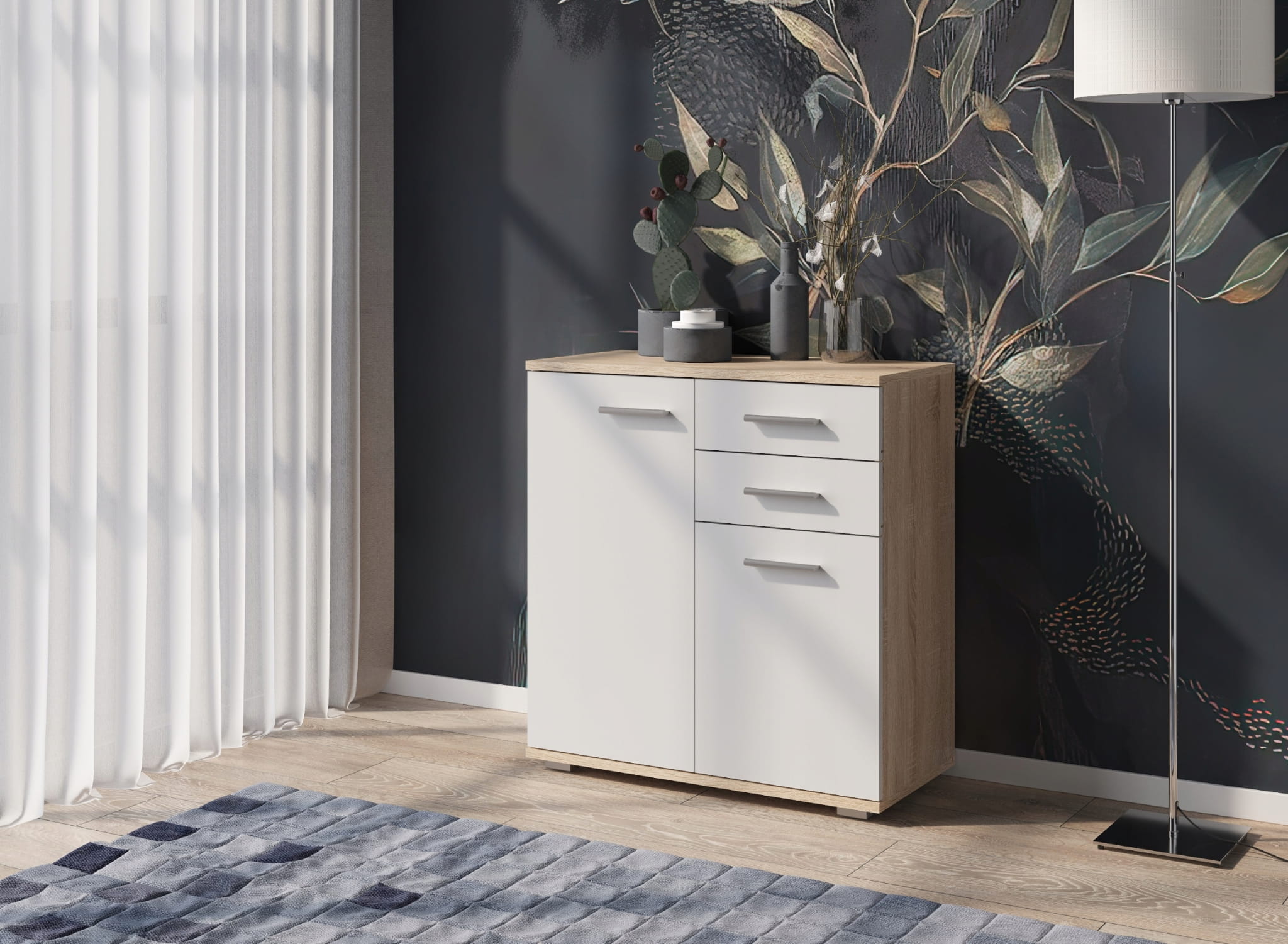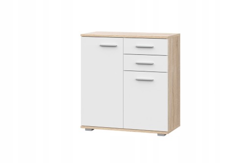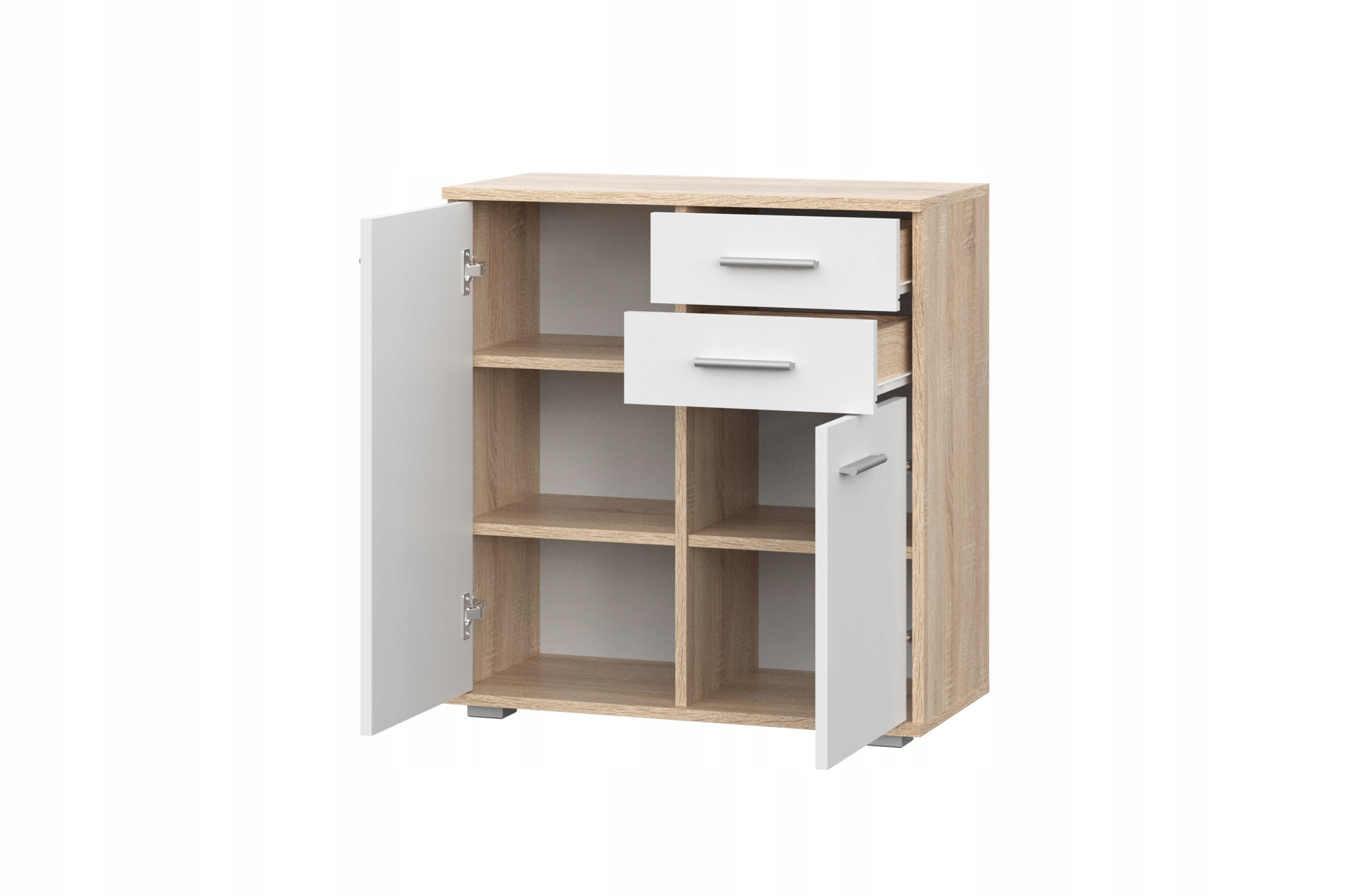 Szukasz kompaktowego mebla, który schowa więcej, niż wygląda? Model FUN KD‑2 to sprytne połączenie dwóch szuflad i dwóch szafek w eleganckim, dwukolorowym wydaniu: ciepły dąb sonoma przełamany śnieżnobiałymi frontami.