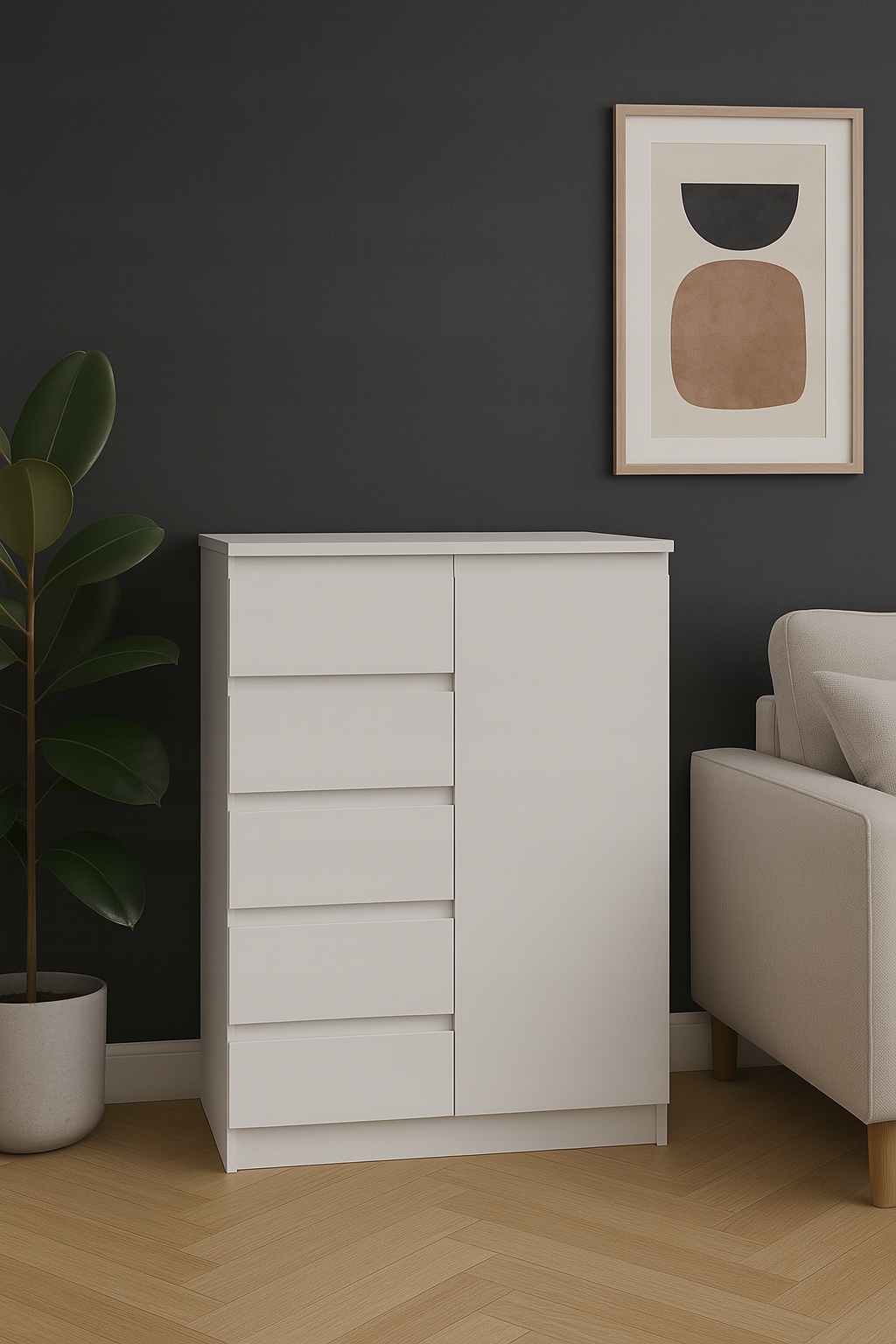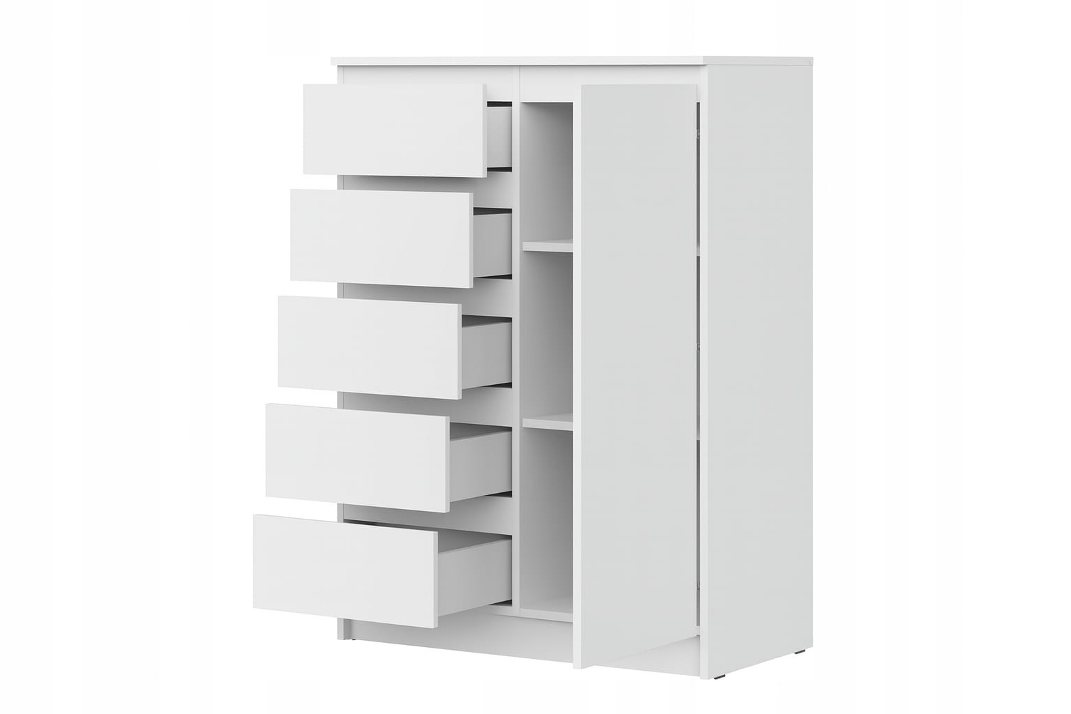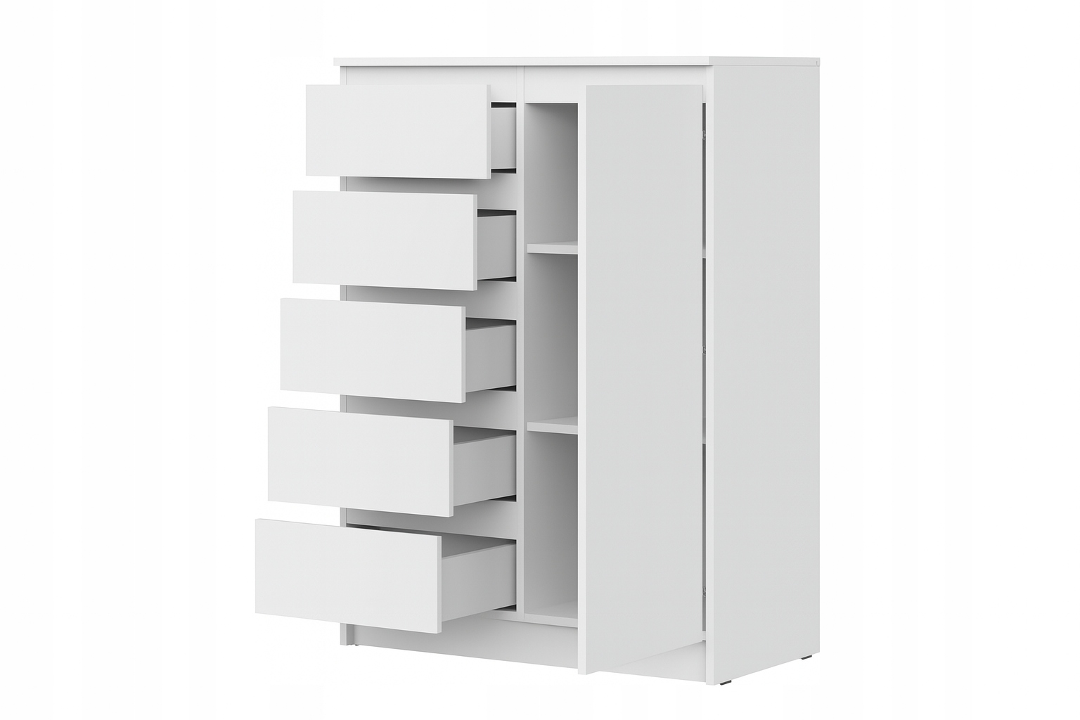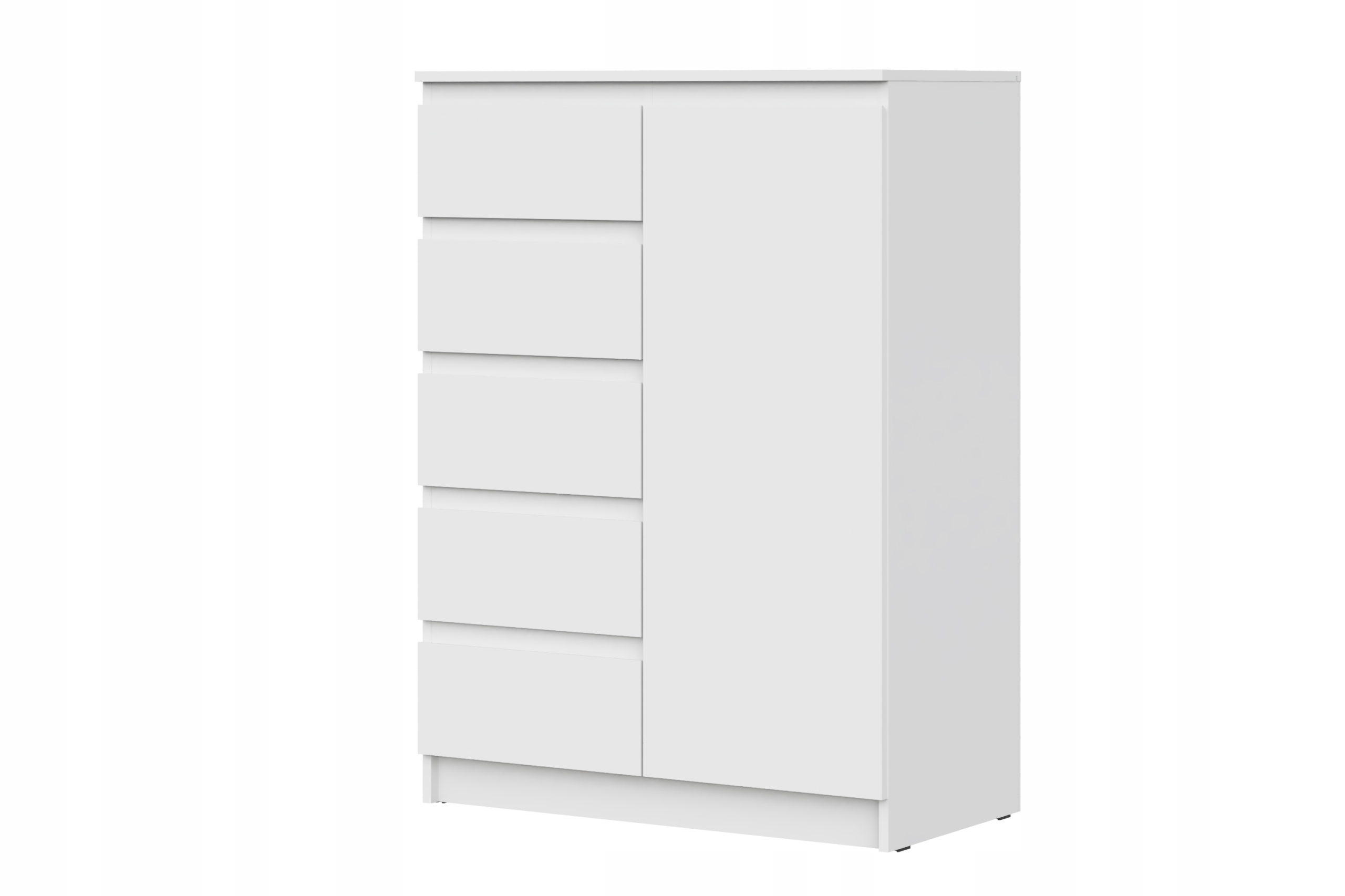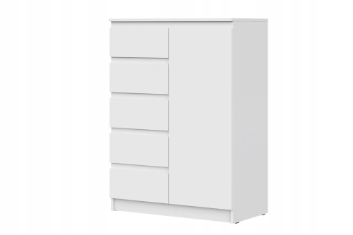 Elegancka bryła w matowej bieli łączy funkcjonalność szafy i komody: pięć bezuchwytowych szuflad płynnie wysuwa się po lewej stronie, a po prawej kryje się pojemna szafka z półką na większe rzeczy. Minimalistyczny front o gładkiej, jednolitej powierzchni wprowadza do wnętrza skandynawską lekkość i optyczny porządek. To mebel idealny do sypialni, przedpokoju czy pokoju dziecka – pomoże zorganizować ubrania, akcesoria i domowe drobiazgi, a zarazem subtelnie odświeży przestrzeń.