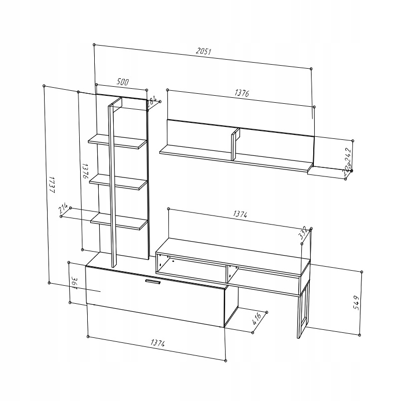 - Kompletny zestaw do strefy TV – regał, szafka RTV z otworami na przewody, pojemna szafka z klapą i półka wisząca = porządek i wygoda.