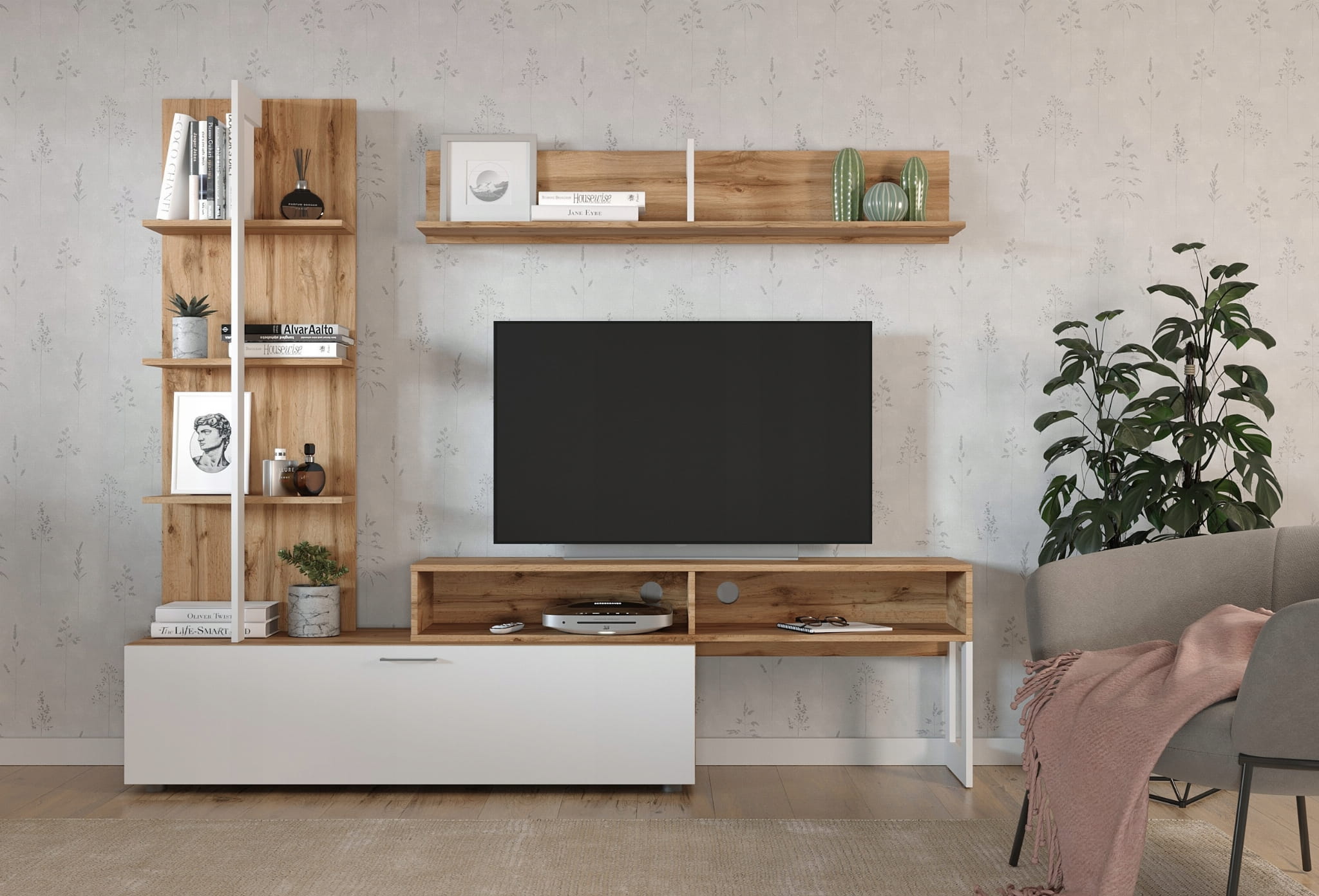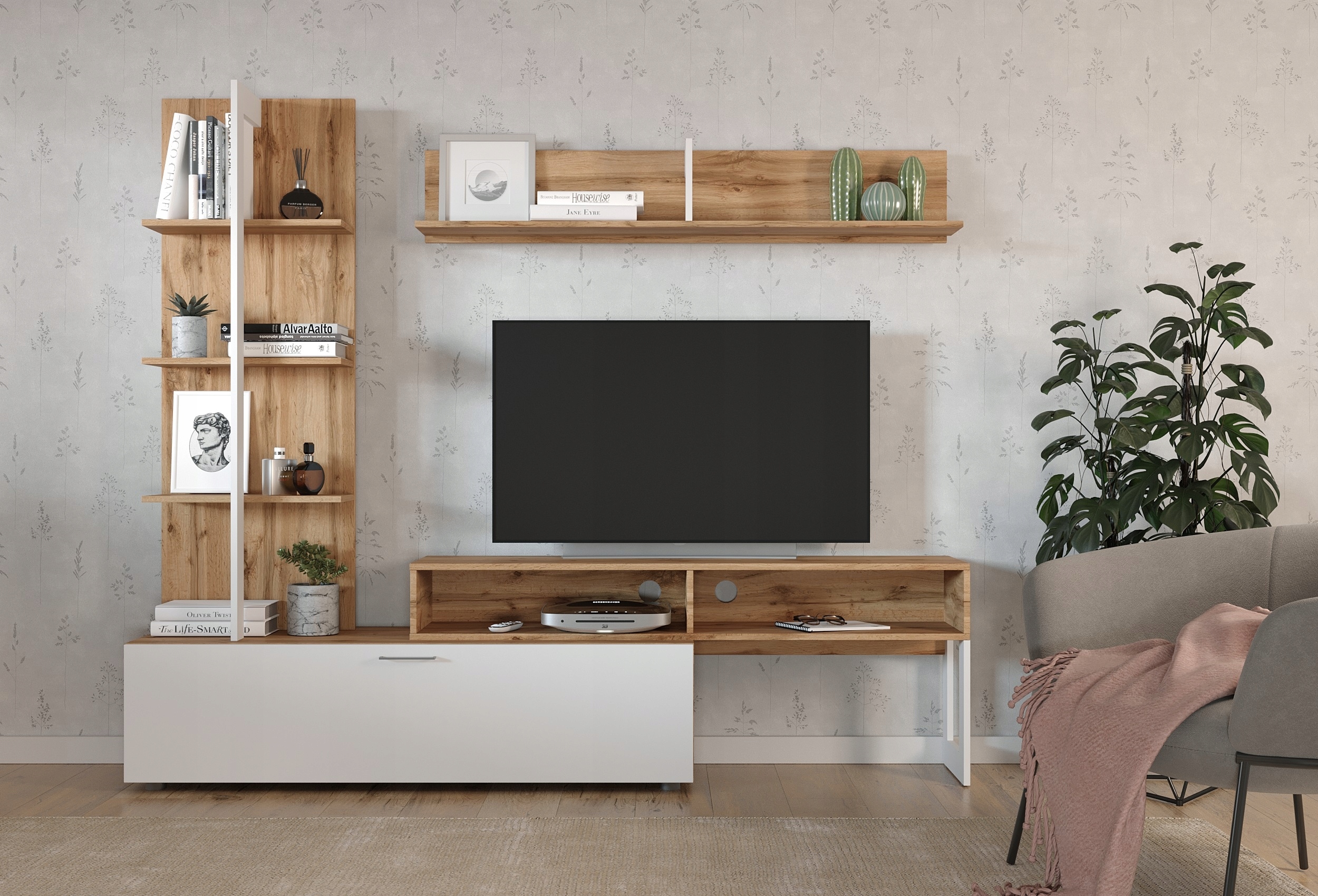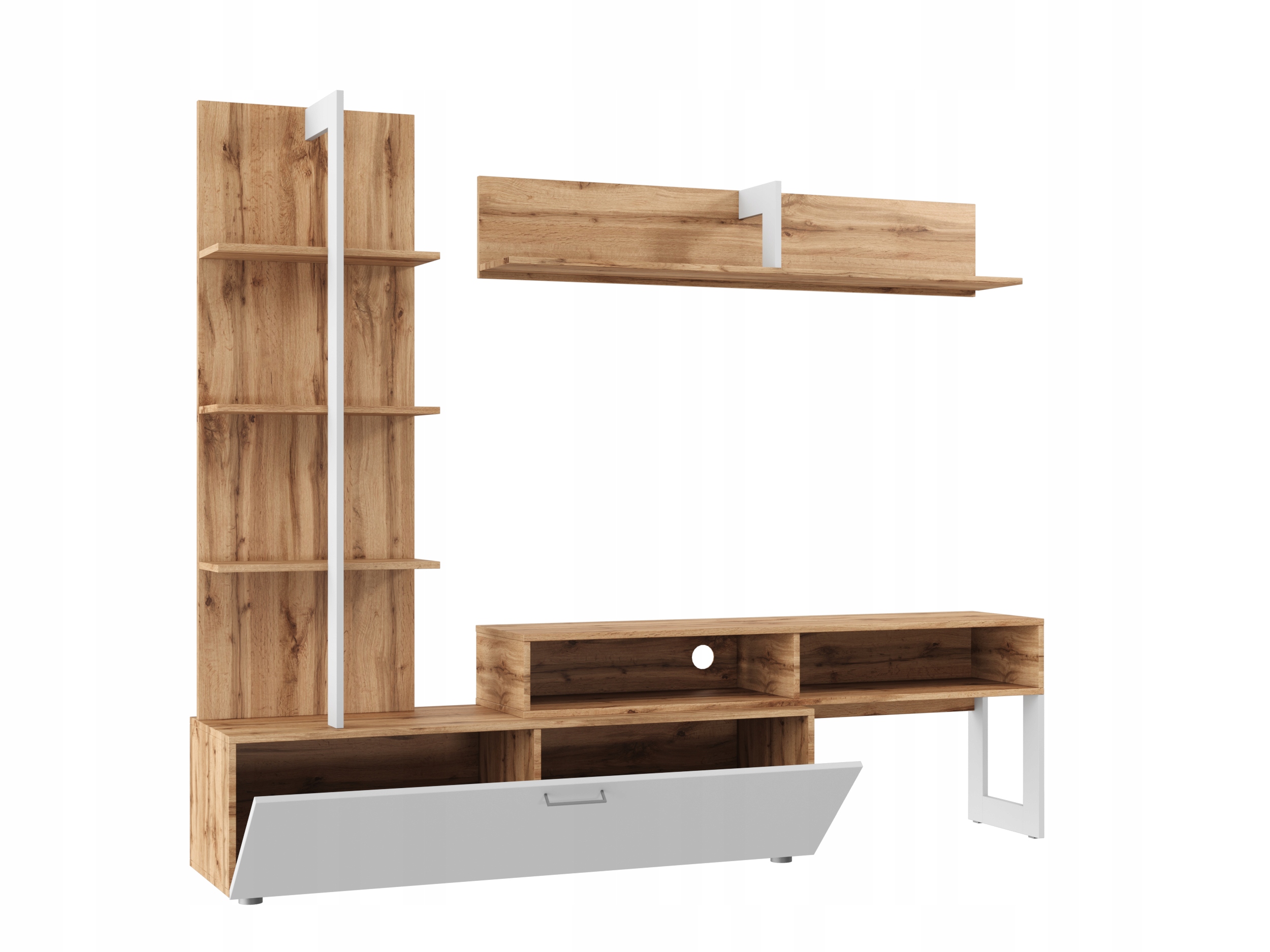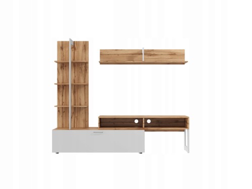 Lekka, nowoczesna meblościanka, która łączy ciepło koloru dąb wotan z rozświetlającą bielą. Zestaw tworzą: wysoki regał z otwartymi półkami na książki i dekoracje, pojemna szafka z klapą (u dołu, w bieli) na rzadziej używane rzeczy, szafka RTV z dwiema wnękami i otworami na kable oraz półka wisząca na dodatki. Smukłe proporcje dodają lekkości, a układ modułów porządkuje strefę TV i ułatwia codzienne funkcjonowanie w salonie. To zestaw, który jednocześnie eksponuje i dyskretnie przechowuje – idealny do nowoczesnych, skandynawskich i loftowych aranżacji.
