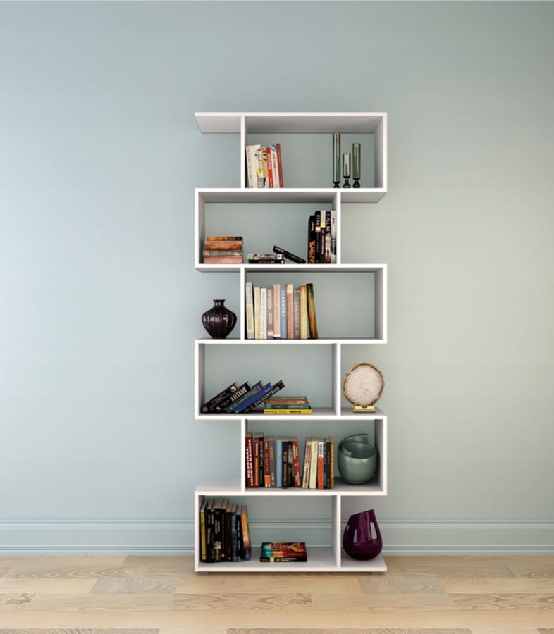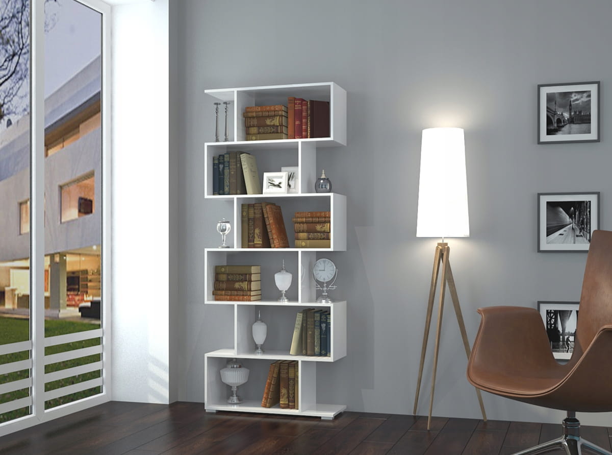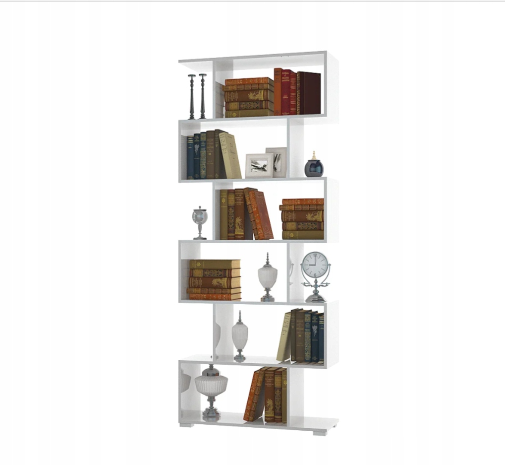 Nowoczesny, asymetryczny regał o otwartej formie w eleganckiej bieli. Geometryczne półki tworzą efektowną, „schodkową” kompozycję, która pięknie eksponuje książki, rośliny i dekoracje. Biel rozjaśnia i optycznie powiększa przestrzeń, dlatego mebel świetnie sprawdzi się w salonie, gabinecie, sypialni czy pokoju młodzieżowym.