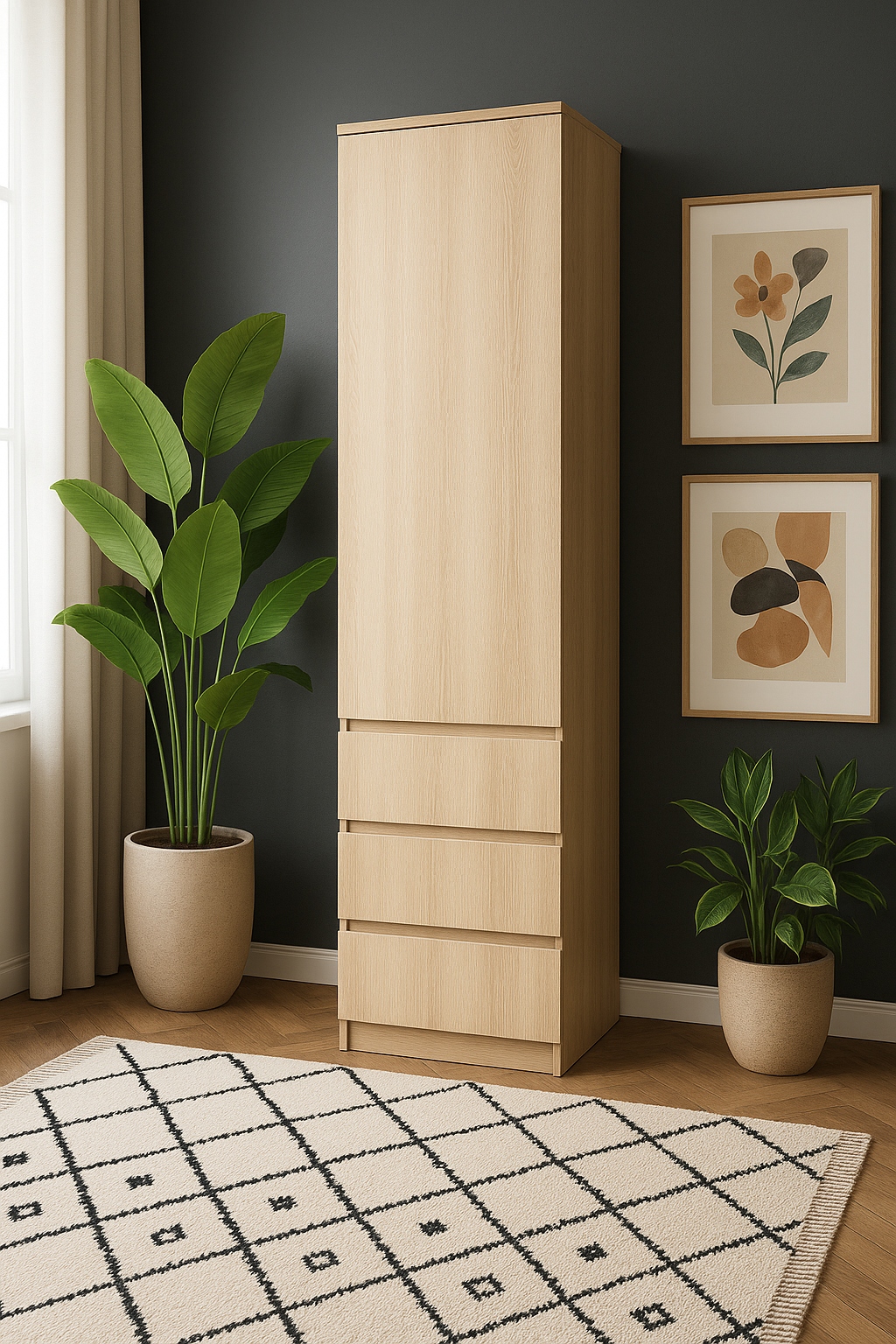 Smukły szafa w ciepłym kolorze dąb sonoma wprowadza do wnętrza przytulną, skandynawską nutę. Trzy półki i ukryte szuflady sprytnie porządkują swetry, ręczniki i drobiazgi, a kompaktowa forma zmieści się w wąskim korytarzu, garderobie czy sypialni. Naturalne odcienie drewna pasuje zarówno do stylu boho i hygge, jak i nowoczesnych aranżacji, dzięki czemu szafa subtelnie dopełnia przestrzeń, nie przytłaczając jej.