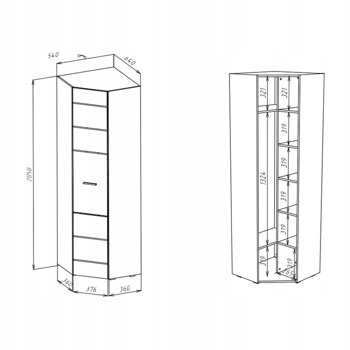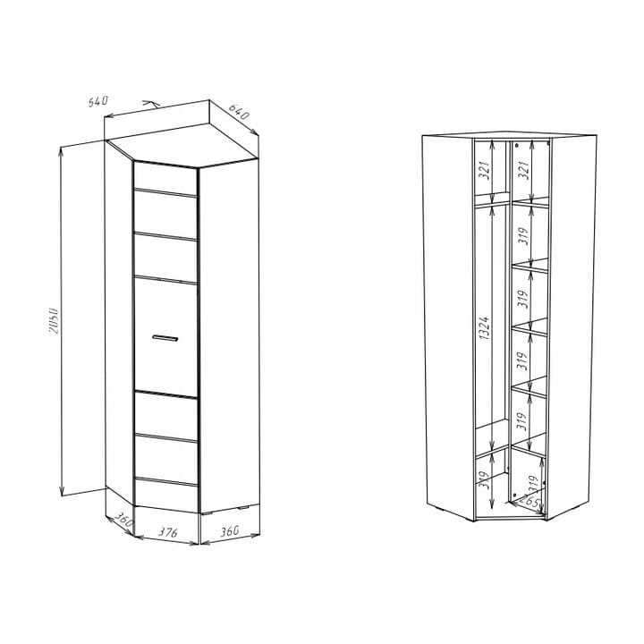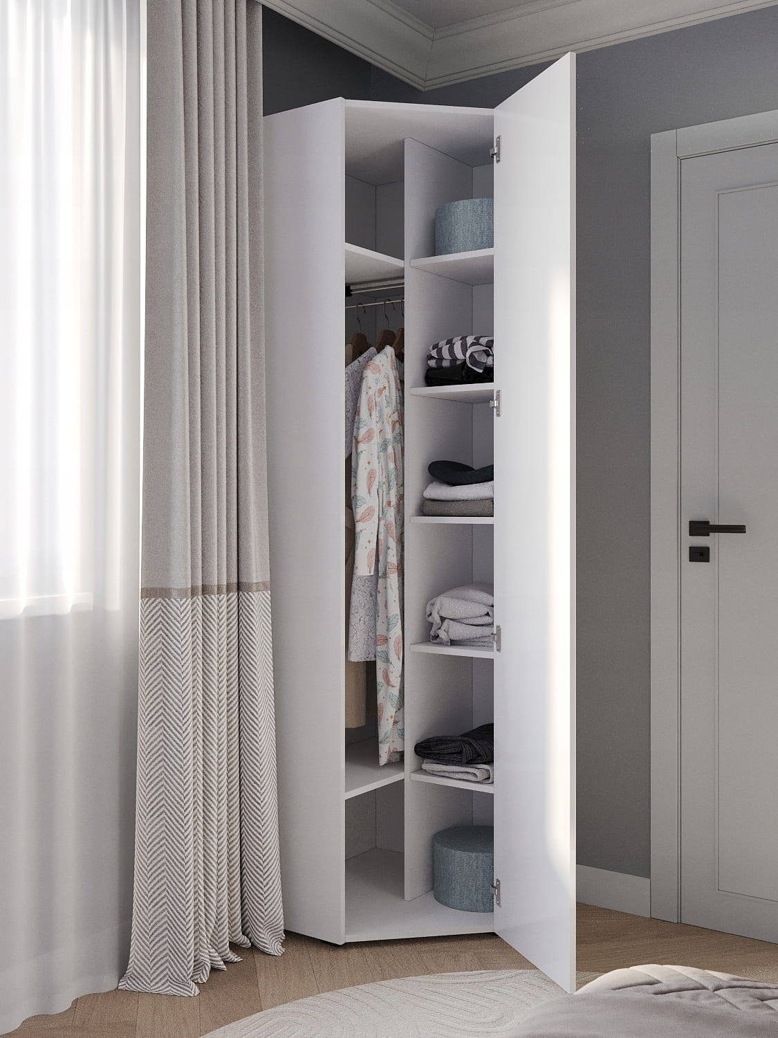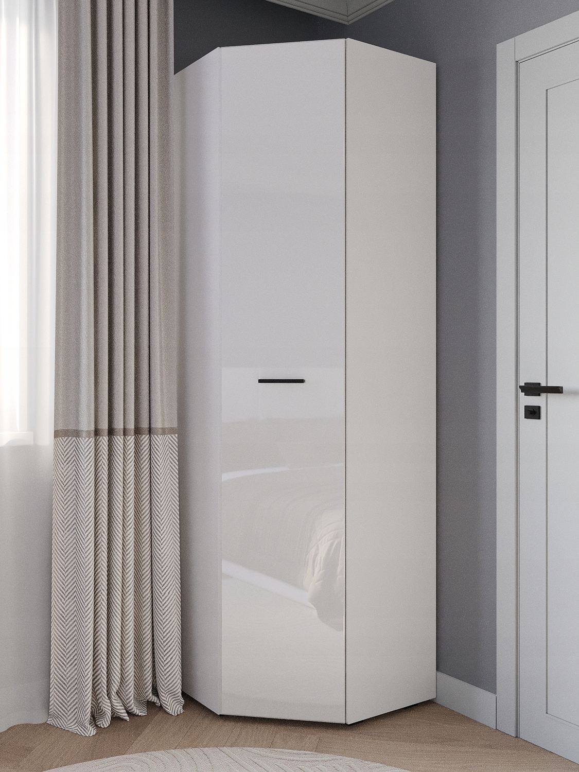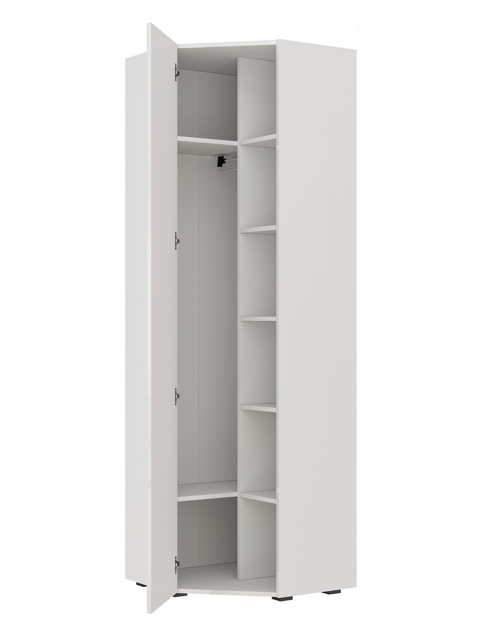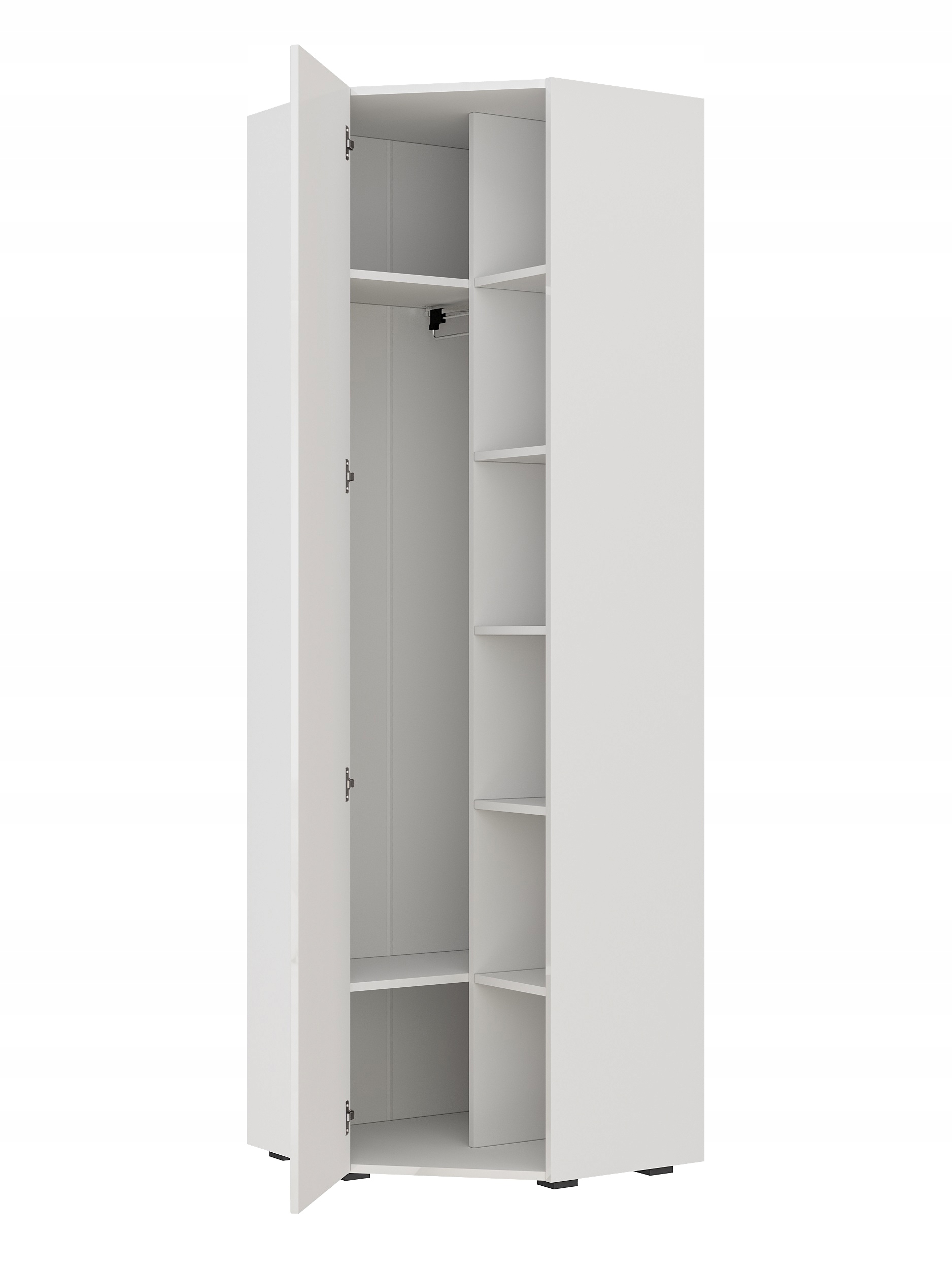 Elegancka szafa, która maksymalnie wykorzystuje róg pomieszczenia i wprowadza do wnętrza dużo światła dzięki frontowi w białym połysku. Smukła, nowoczesna bryła świetnie sprawdzi się w sypialni, garderobie, pokoju młodzieżowym czy przedpokoju. W środku znajdziesz funkcjonalną przestrzeń do przechowywania – miejsce na odzież wiszącą oraz półki na złożone ubrania i akcesoria – więc łatwo zaprowadzisz porządek nawet w mniejszym pokoju.