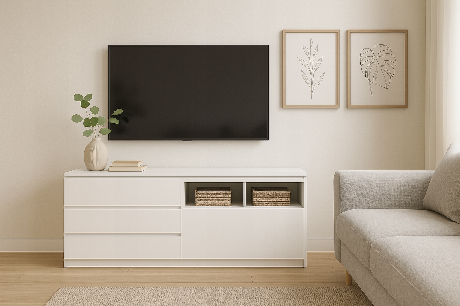 Nowoczesna, niska szafka RTV w uniwersalnej bieli łączy lekki design z dużą funkcjonalnością. Szeroki blat pomieści telewizor, a dwie otwarte wnęki są idealne na dekoder, konsolę. Z lewej trzy pojemne szuflady, z prawej zamykana szafka – wszystko, co nie musi być na widoku, pozostanie schowane. Gładkie, bez uchwytowe fronty łatwo utrzymać w czystości i pasują do wielu aranżacji.