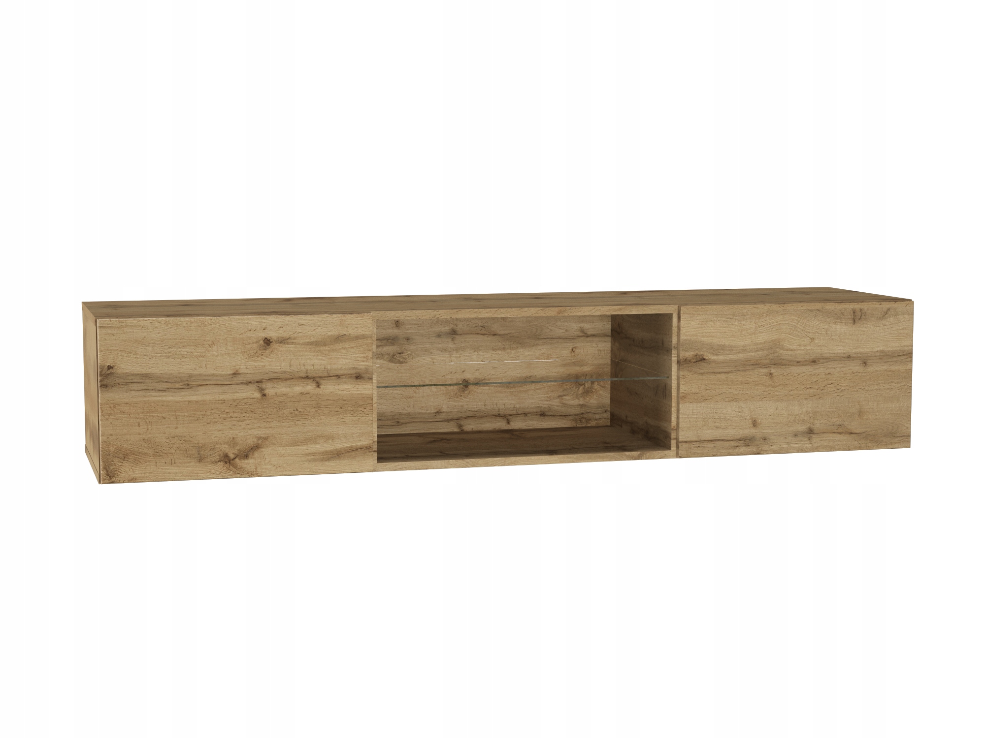Nowoczesna, wisząca szafka RTV w kolorze dąb wotan. Posiada dwie zamykane komory po bokach oraz otwartą wnękę na środku z elegancką, szklaną półką – idealną na dekoder, konsolę. Gładkie, bezuchwytowe fronty podkreślają minimalistyczny charakter mebla.