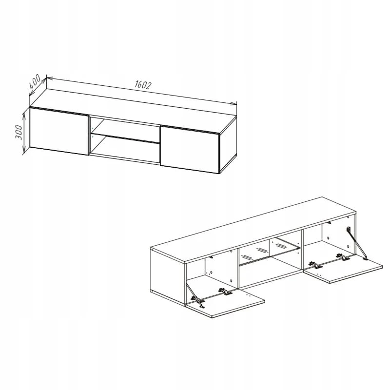 - Funkcjonalny układ – zamknięte schowki + środkowa wnęka z półką na sprzęt RTV.
