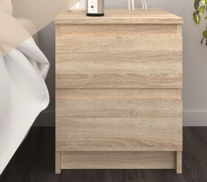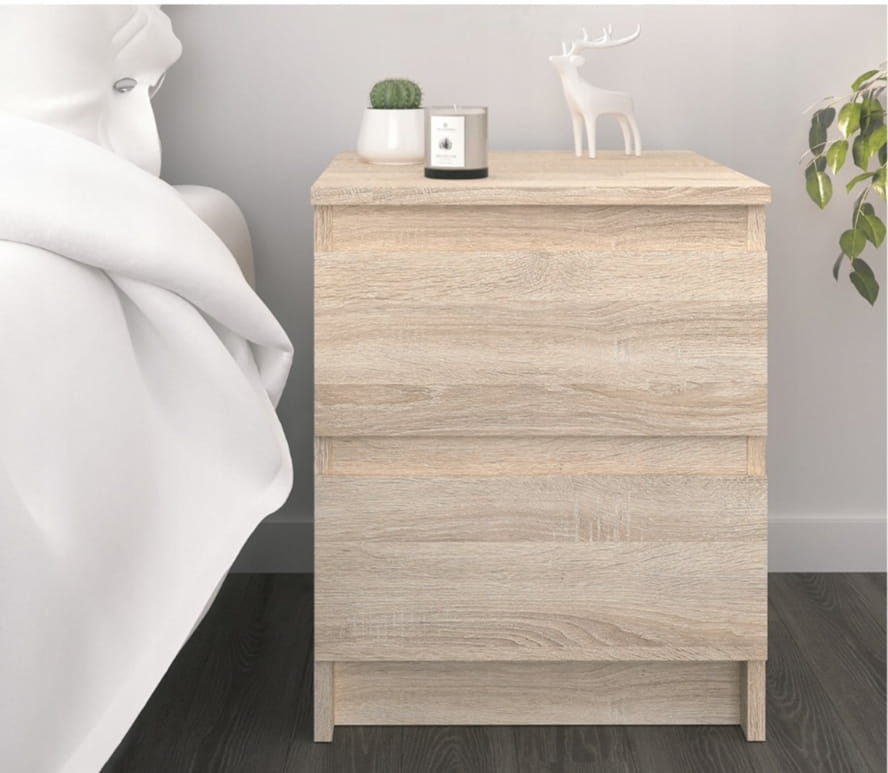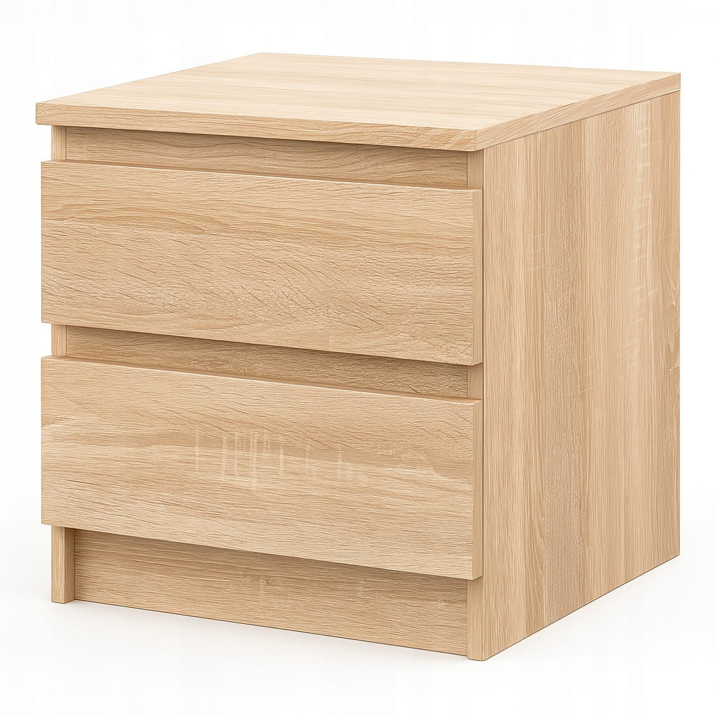 Szafka nocna w ciepłym odcieniu dąb sonoma to esencja minimalistycznej wygody: kompaktowa bryła o gładkich, bezuchwytowych frontach skrywa dwie przestronne szuflady, w których dyskretnie schowasz wieczorną lekturę, ładowarkę czy kosmetyki, a wytrzymały, laminowany blat z naturalnym rysunkiem słojów pomieści lampkę, świecę lub filiżankę kawy, dodając wnętrzu przytulności i porządku, bez względu na to, czy urządzasz sypialnię w stylu skandynawskim, boho, czy industrialnym.