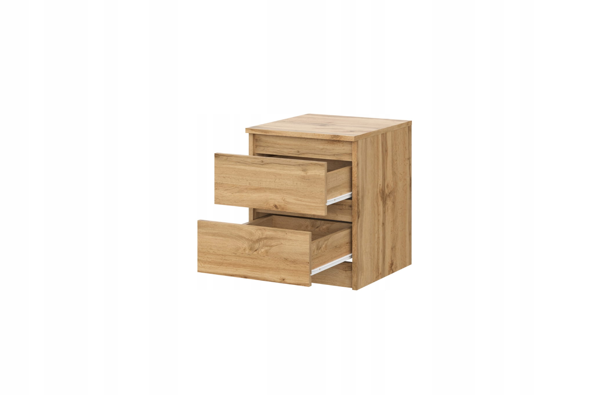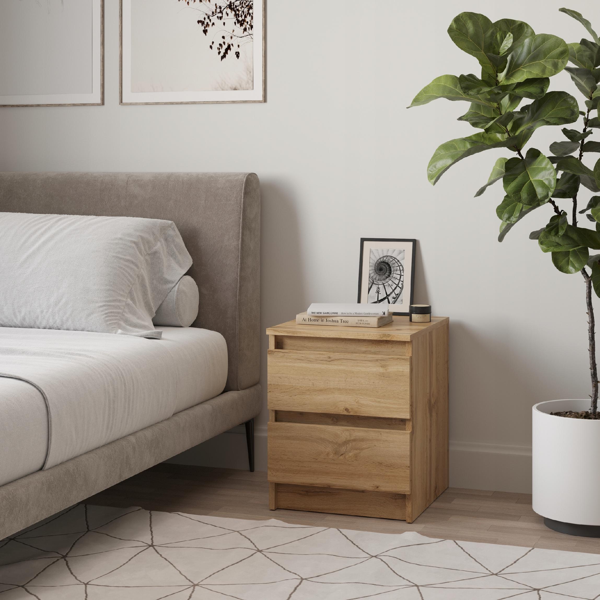 Szafka nocna w odcieniu dąb wotan to esencja minimalistycznej wygody: kompaktowa bryła o gładkich, bezuchwytowych frontach skrywa dwie przestronne szuflady, w których dyskretnie schowasz wieczorną lekturę, ładowarkę czy kosmetyki, a wytrzymały, laminowany blat z naturalnym rysunkiem słojów pomieści lampkę, świecę lub filiżankę kawy, dodając wnętrzu przytulności i porządku, bez względu na to, czy urządzasz sypialnię w stylu skandynawskim, boho, czy industrialnym.