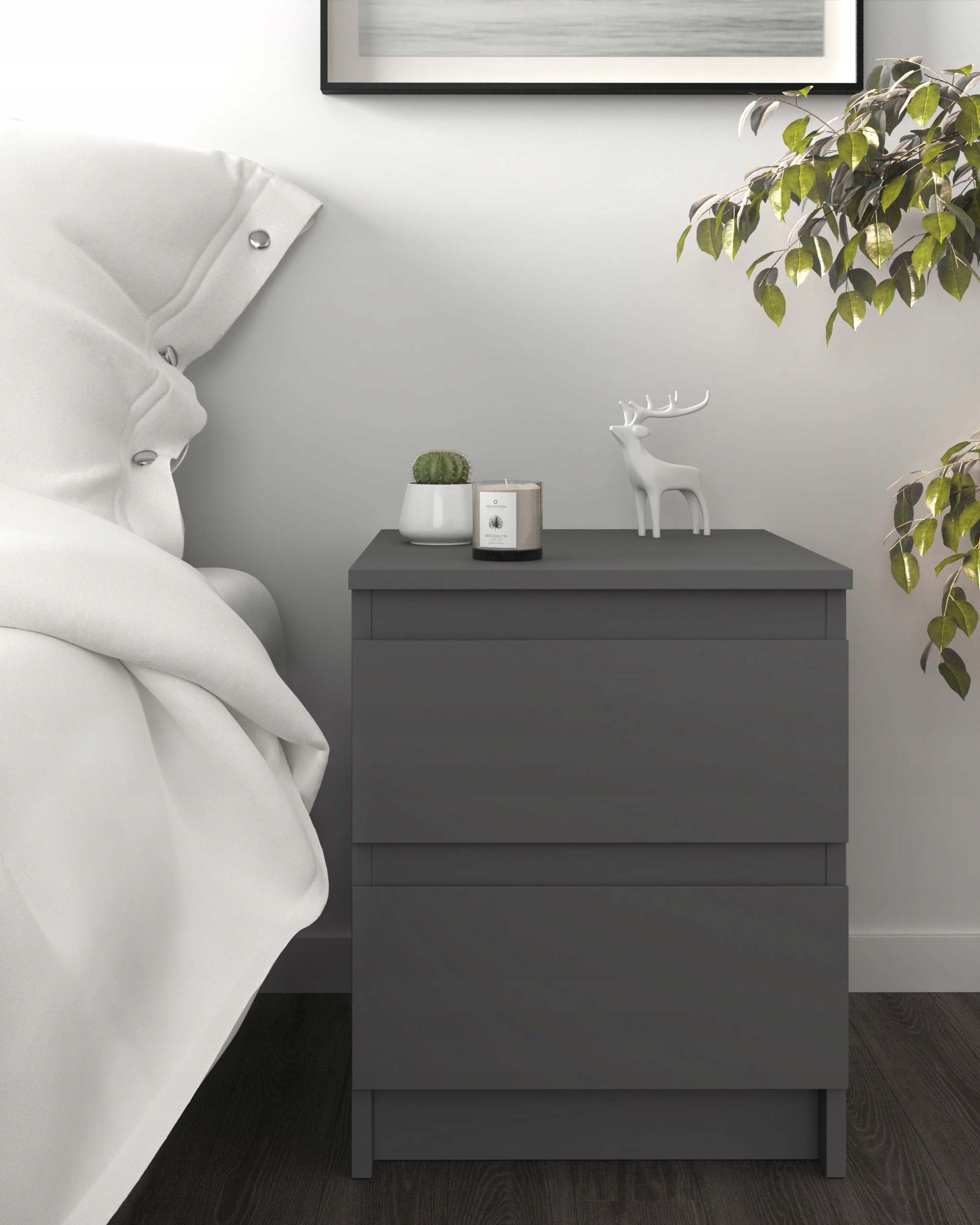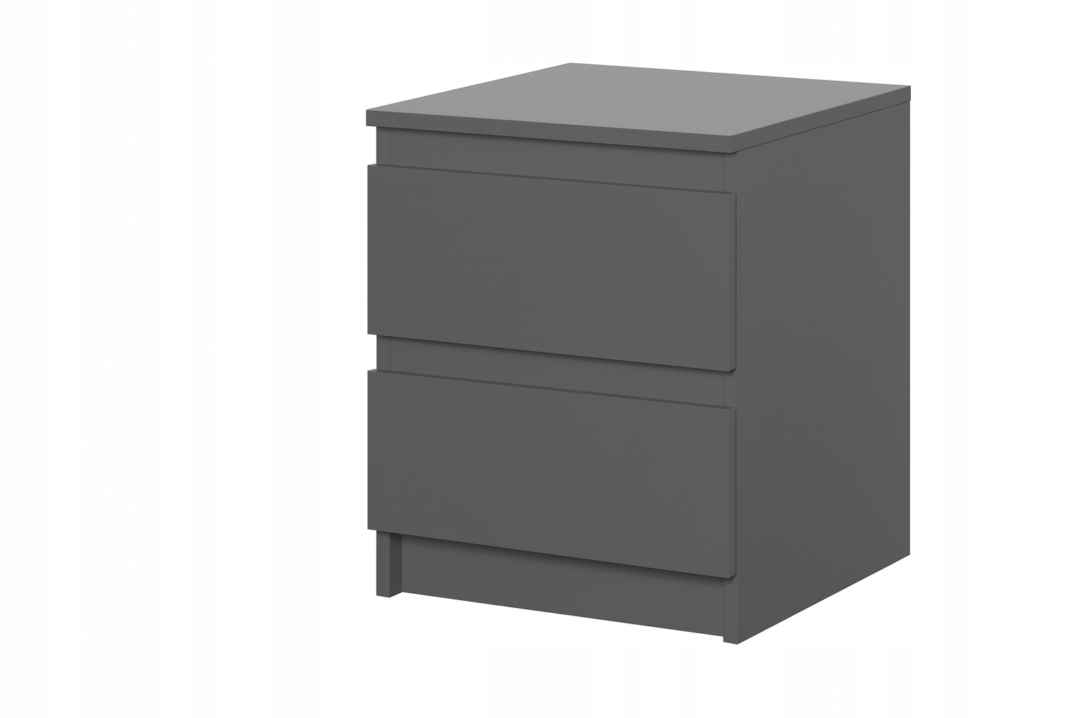 Szafka nocna w kolorze szary grafit to esencja minimalistycznej wygody: kompaktowa bryła o gładkich, bezuchwytowych frontach skrywa dwie przestronne szuflady, w których dyskretnie schowasz wieczorną lekturę, ładowarkę czy kosmetyki, a wytrzymały, laminowany blat pomieści lampkę, świecę lub filiżankę kawy, dodając wnętrzu przytulności i porządku, bez względu na to, czy urządzasz sypialnię w stylu skandynawskim, boho, czy industrialnym.
