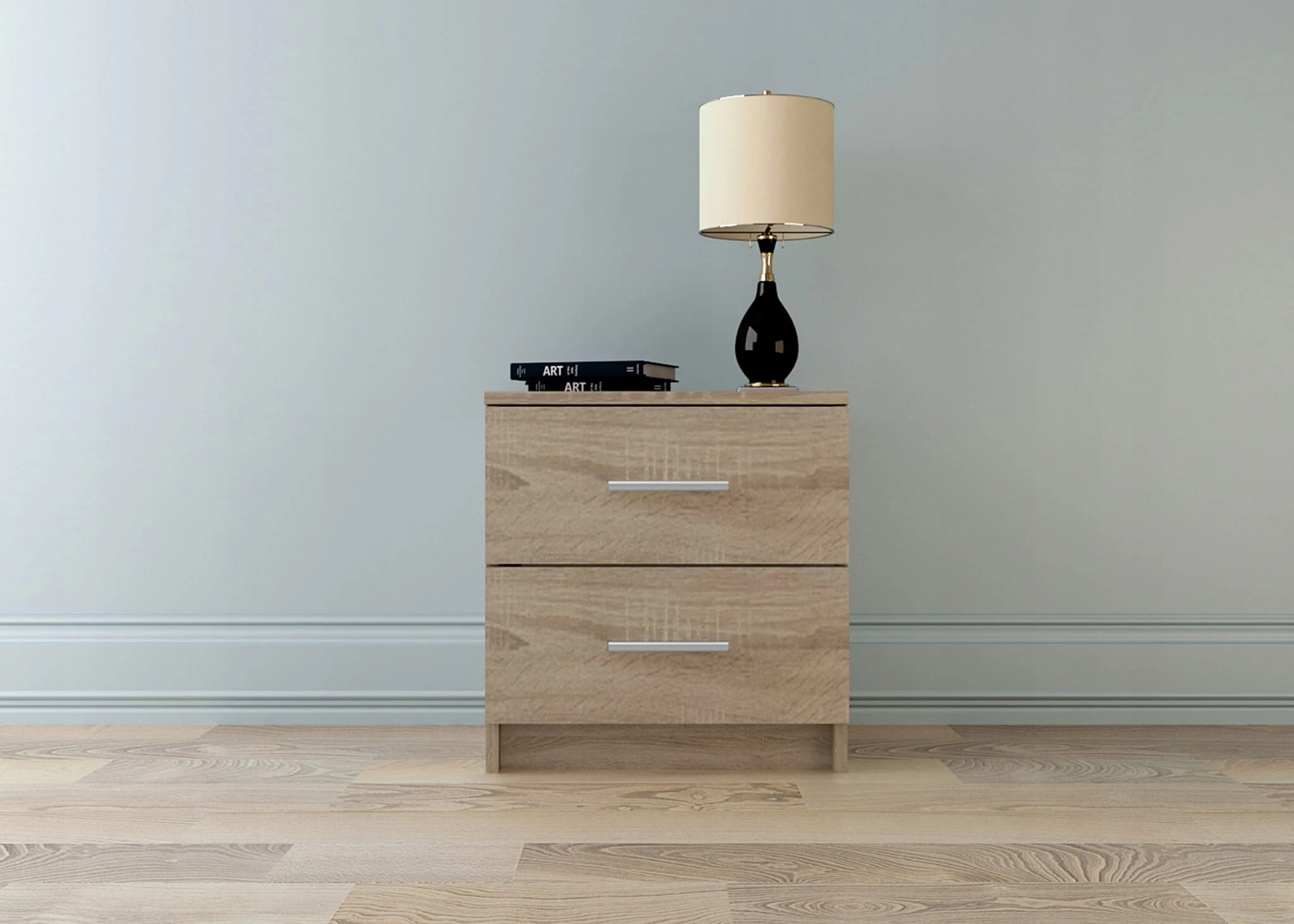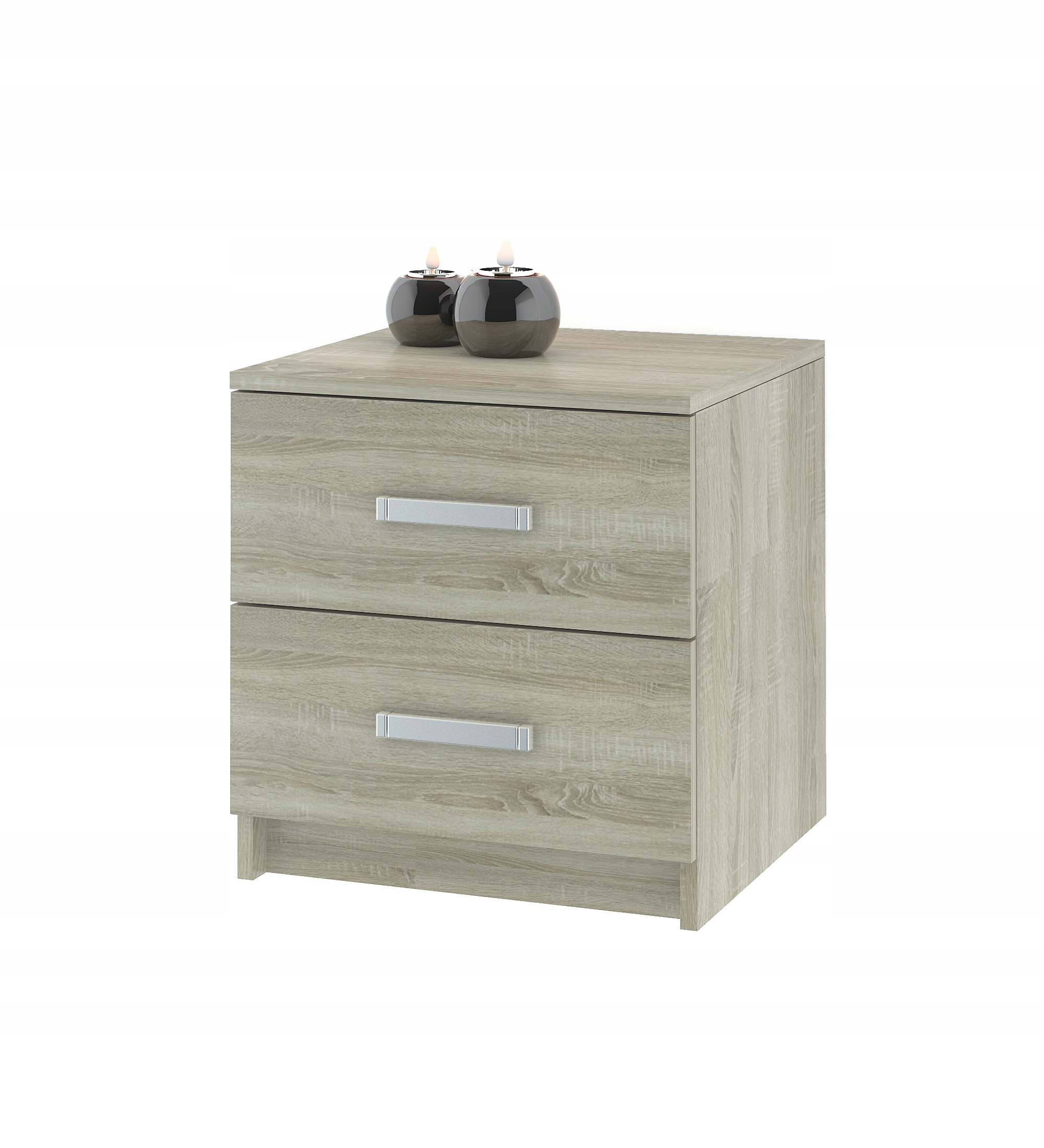 Zgrabna szafka nocna o kompaktowych wymiarach, idealna do sypialni czy pokoju młodzieżowego. Dwie równe szuflady pomieszczą bieliznę, dokumenty lub drobiazgi, a blat posłuży na lampkę, książkę czy telefon. Ciepły dekor dąb sonoma w połączeniu z klasycznymi uchwytami dodaje wnętrzu przytulności i łatwo łączy się z różnymi stylami aranżacji.