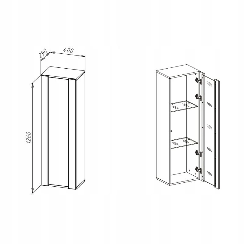 Szafka charakteryzuje się głębokością 29 cm, szerokością 40 cm oraz wysokością 126 cm, co czyni ją idealnym rozwiązaniem do mniejszych pomieszczeń. Mebel jest wykonany z wysokiej jakości materiałów, co gwarantuje jego trwałość i odporność na codzienne użytkowanie. Oprócz funkcji przechowywania, szafka została wyposażona w oświetlenie , które dodaje charakteru oraz pozwala na efektowne wyeksponowanie przechowywanych w niej przedmiotów.