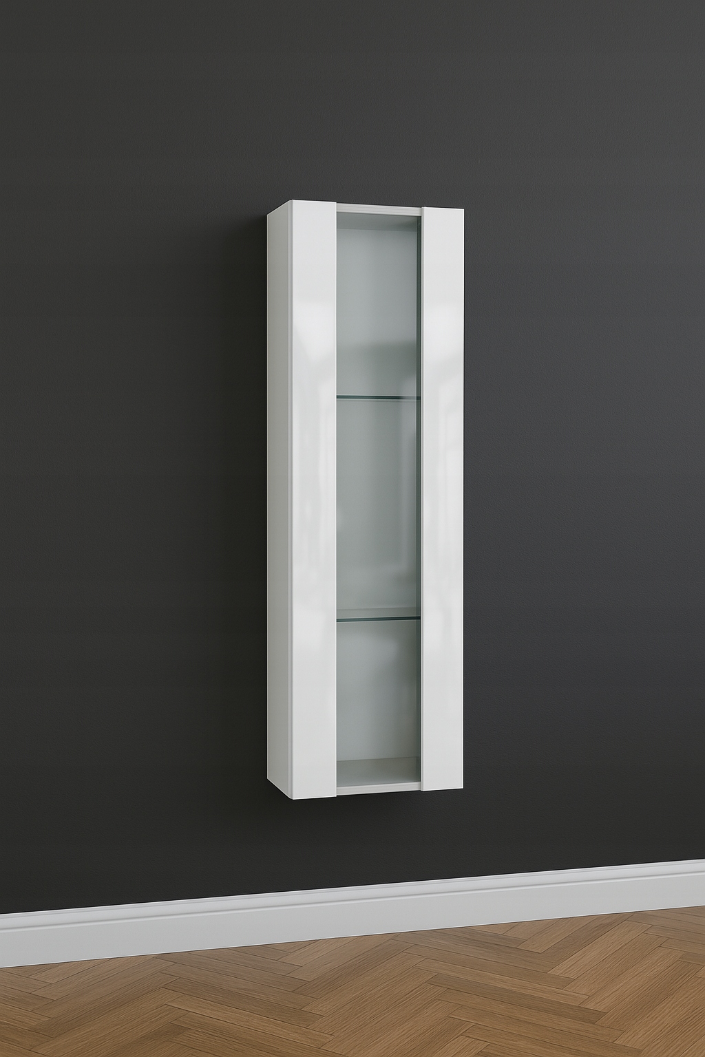 Elegancka witryna w kolorze biały połysk to idealny sposób, by wyeksponować ulubione dekoracje i jednocześnie rozjaśnić wnętrze. Smukła, nowoczesna bryła z bezuchwytowym frontem oraz przeszkloną częścią ekspozycyjną subtelnie podkreśla charakter salonu, jadalni czy biura. Wewnątrz znajdują się praktyczne półki, na których ustawisz szkło, porcelanę, książki lub pamiątki – wszystko estetycznie uporządkowane, ale na widoku. Błyszczące wykończenie optycznie powiększa przestrzeń i świetnie komponuje się z aranżacjami w stylu nowoczesnym, glamour i soft‑scandi.