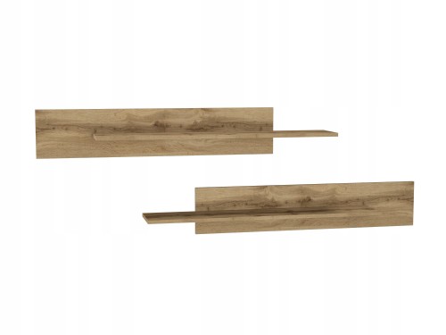 Zestaw nowoczesnych półek ściennych w kolorze dąb wotan, składający się z dwóch elementów o prostym i minimalistycznym designie. Półki osadzone są na szerokich panelach, co zapewnia im stabilność oraz ułatwia montaż. Idealnie sprawdzą się jako miejsce na książki, dekoracje, ramki ze zdjęciami czy drobne akcesoria, nadając wnętrzu lekkości i elegancji.