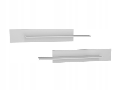 Zestaw nowoczesnych półek ściennych w kolorze białym, składający się z dwóch elementów o prostym i minimalistycznym designie. Półki osadzone są na szerokich panelach, co zapewnia im stabilność oraz ułatwia montaż. Idealnie sprawdzą się jako miejsce na książki, dekoracje, ramki ze zdjęciami czy drobne akcesoria, nadając wnętrzu lekkości i elegancji.